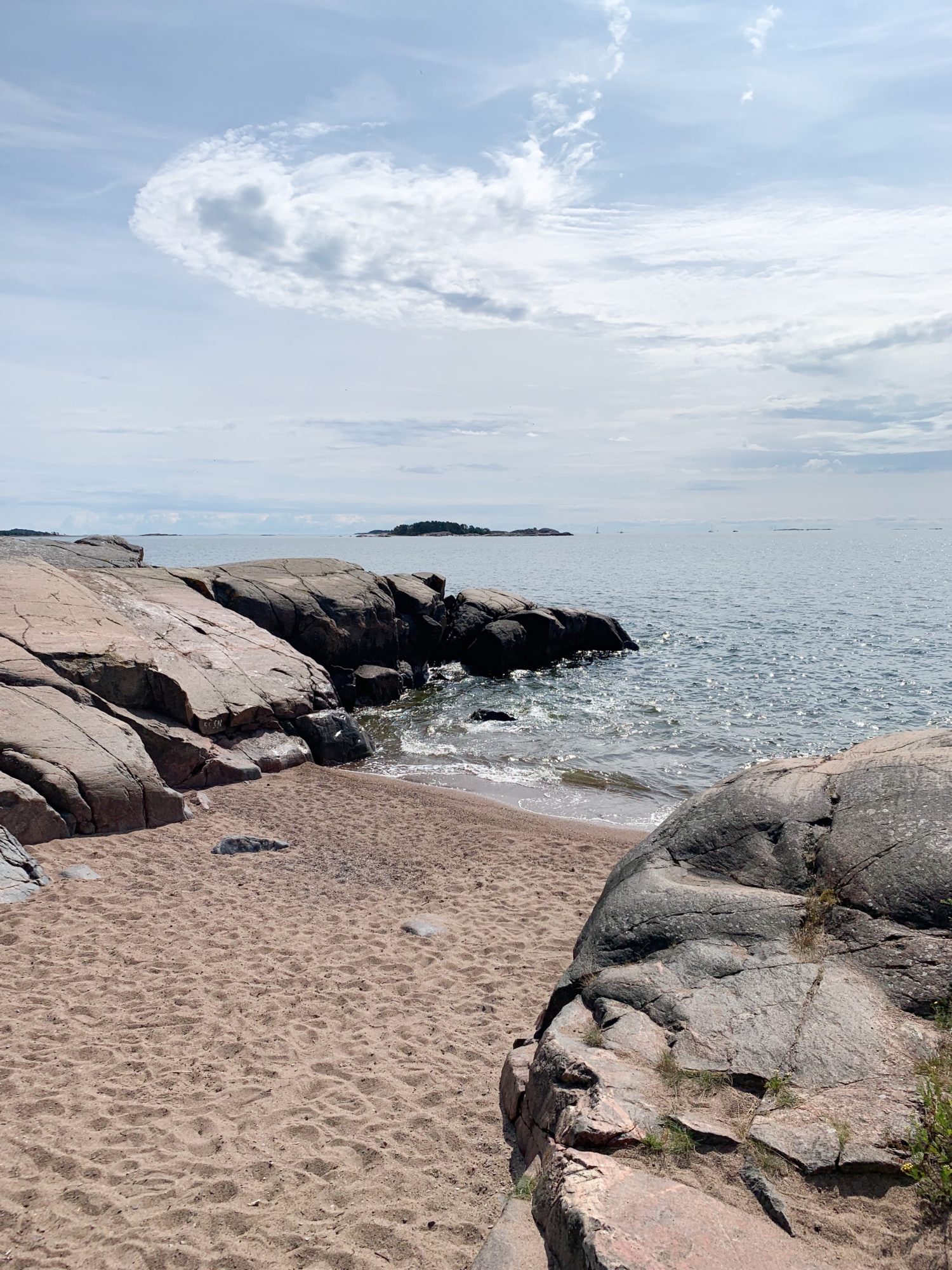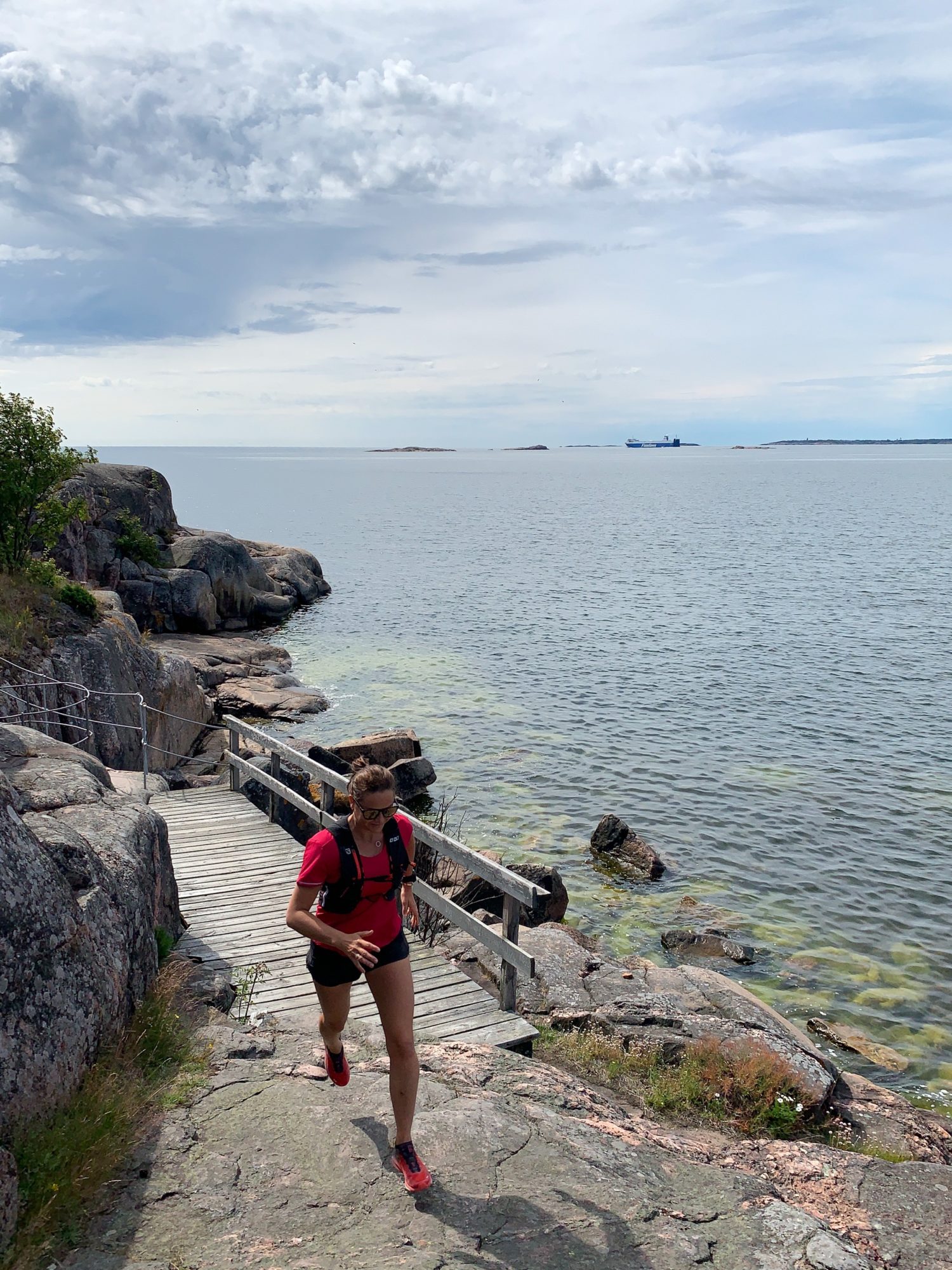 Maanantain ohjauksen jälkeen lähdin omalle lenkille. Yritän aina uusissa maisemissa päästä lenkille, vaihtelu virkistää. Täytin vesipullot ja laitoin varuksi juoksuliivin selkään. Lomalla, kun on, ei voi tietää, kuinka lenkit venähtävät. Hangon merenrantamaisemat ovat kauniit ja maasto vaihteleva, välillä juoksentelin kallioilla, välillä taas polkuja pitkin ja hiekkarannalla. Harvemmin pysyn merkityillä poluilla, sillä olen huomannut, että juuri sivupoluilta avautuvat upeimmat maisemat. Luonto, se on ollut tämän loman ja kesän avainsana.