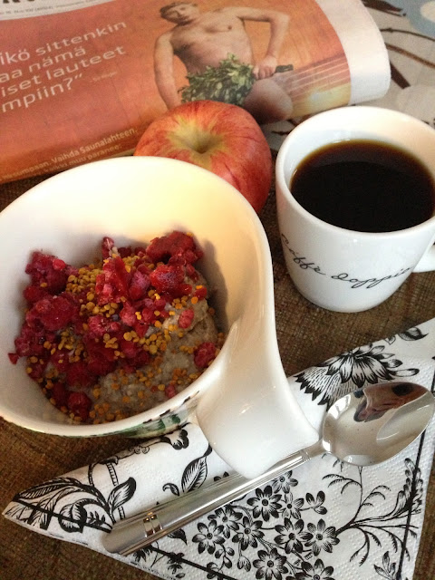 Herkullista aamupalaa… banaani/chiapuddingia, omena ja kahvi.