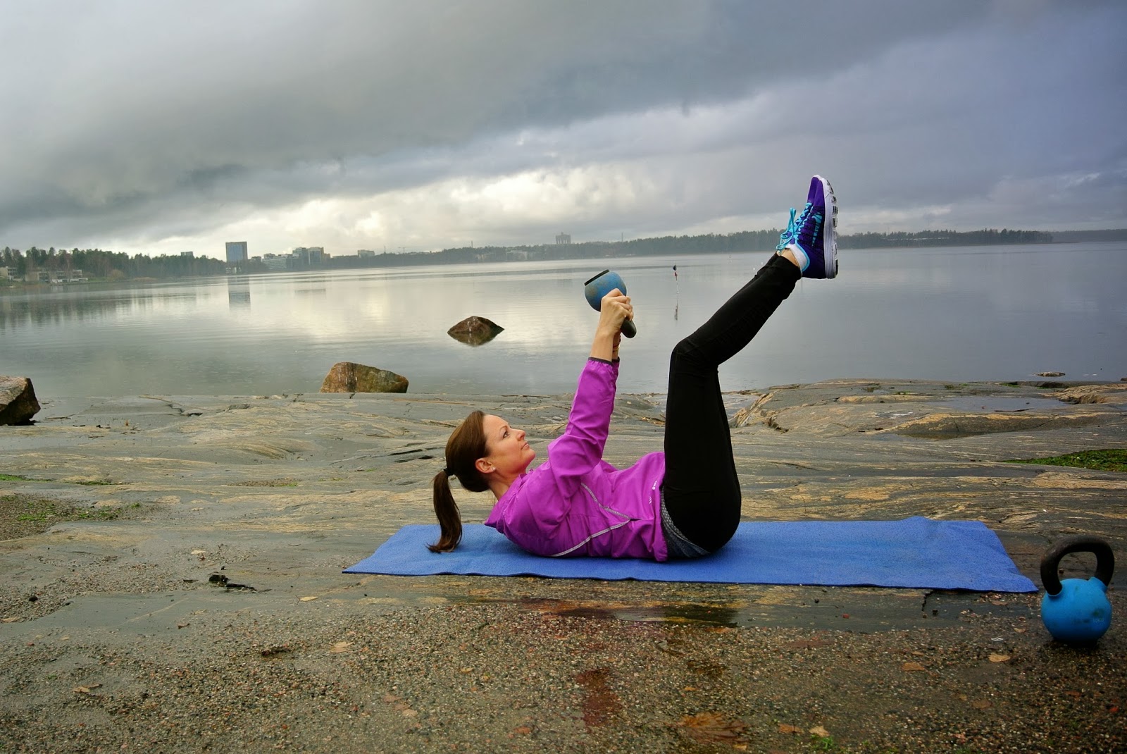 Vihdosta viimein sain tehtyä vatsalihastreeni-videon loppuun 🙂 Videolla treenataan kokonaisvaltaisesti niin suorat-, vinot-, kuin poikittaiset vatsalihakset. Voit tehdä jokaista liikettä 10-15, oman kunnon mukaan. Liikkeiden välissä voit myös tarvittaessa pitää pienen tauon. Tee kaikki liikkeet läpi 2-3 kertaa. Toistojen määrää tärkeämpää on muistaa tekniikka. Jos esimerkiksi alaselkä menee notkolle ja nousee matosta, on syytä jättää kuula kokonaan sivuun. Jokaisen liikkeen voit siis tehdä myös ilman kahvakuulaa. Ja muista hengittää!
