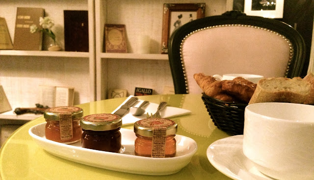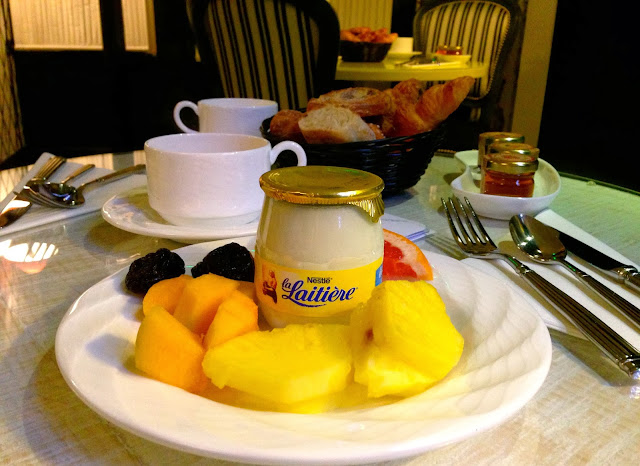 Aamupalalla ranskalaiseen tyyliin! Omalle lautaselle kasaantui paljon hedelmiä ja luonnonjugurttia. Rakastan aamupaloja, mutta näin aikaisin en pysty syömään vielä paljoakaan- varsinkaan, jos olen menossa treenaamaan. Croissantit eivät ole koskaan ollut mun juttu, mutta kovakuorinen maalaispatonki aprikoosihillolla…. Mmmmm. Ja hotellin sisustus on todella kaunis- jokaista yksityiskohtaa myöden.