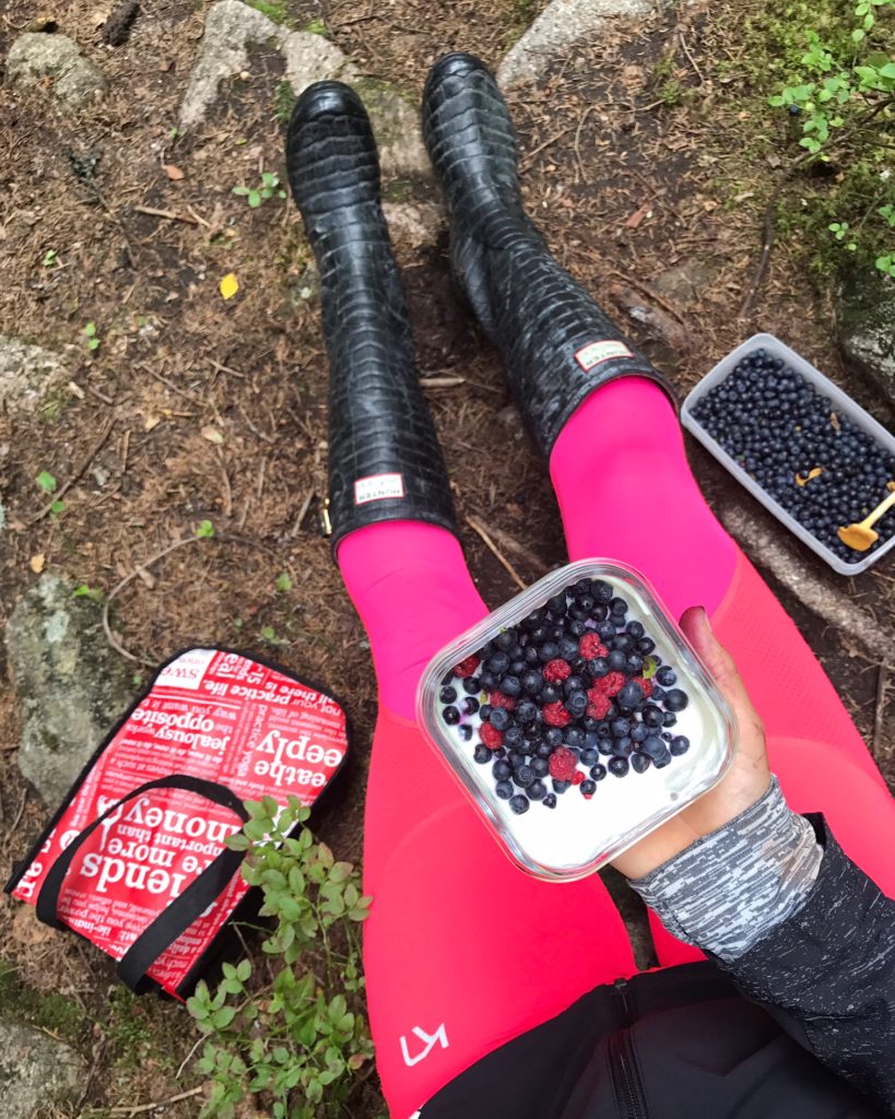 Viime viikolla treenattavien välissä poimin marjoja, joista osa pääsi välipalani joukkoon. Luomu soijajugurtti kulki kätevästi lasisessa säilytysrasiassa, päälle vadelmia ja mustikoita.