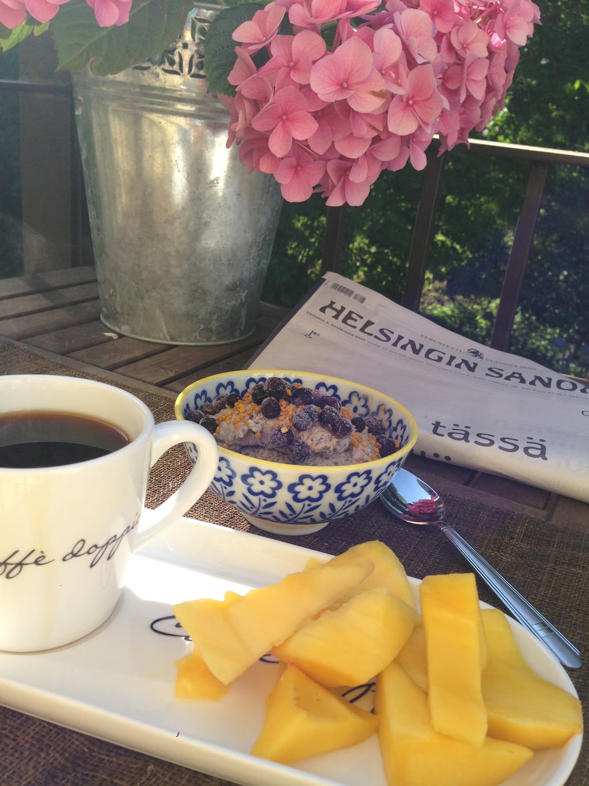 Aamupalana maistui, mikas muu kuin mango, ja eilen valmistettu banaani/chiapudding vaniljalla ja kanelilla maustettuna. Paalle ripottelin viela mustikoita ja mehilaisensiitepolya. Espanjassa sain allergiaoireita joistakin kasveista.