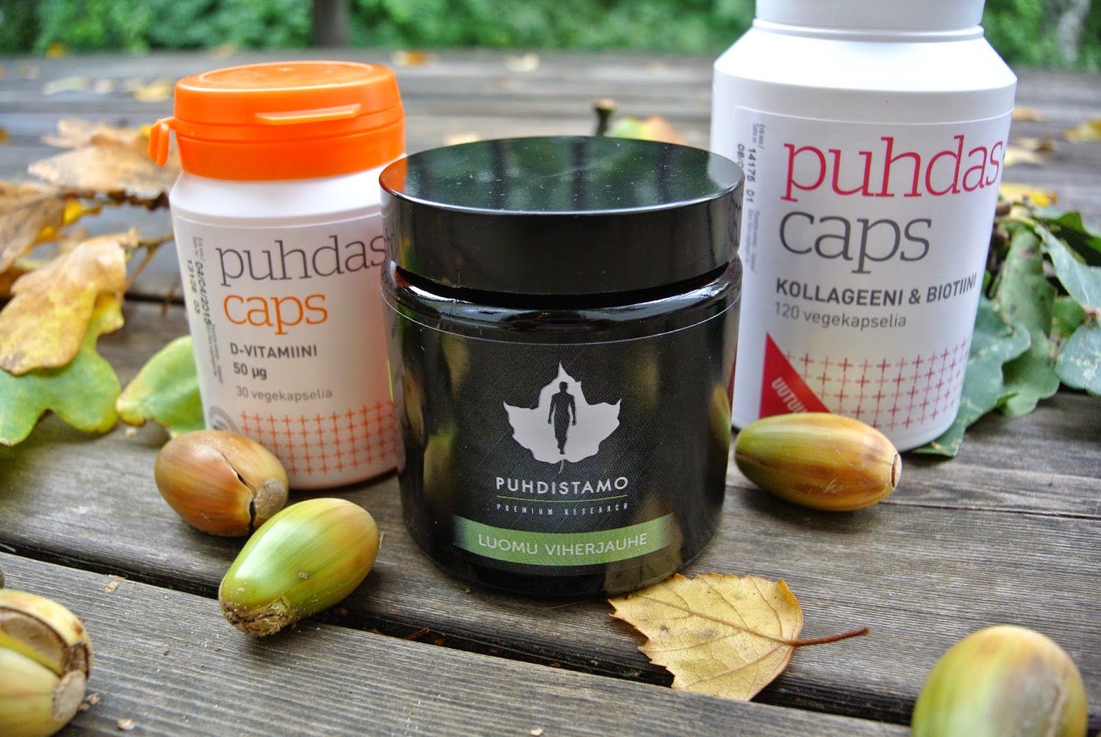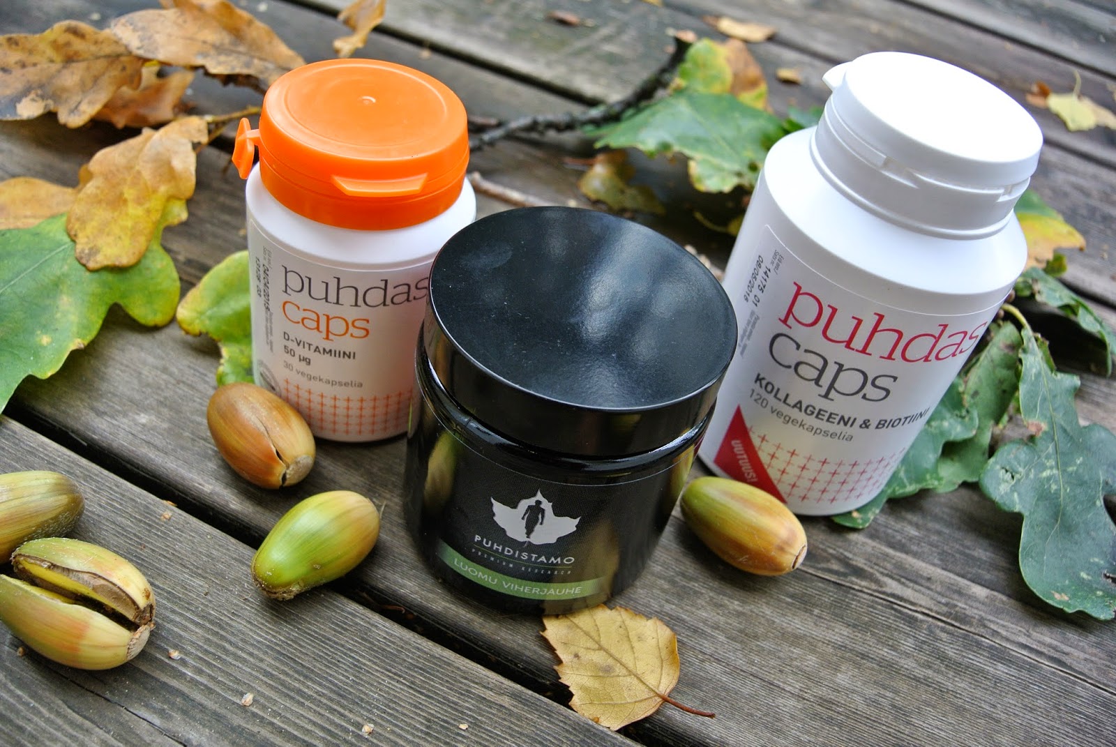Iloisia uutisia nyt myös teille lukijoille; sain Terveysmarketilta arvottavaksi paketin Puhdas + Capsin D-vitamiinia ja Kollageeni & Biotiinia, sekä Puhdistamon viherjauhetta! Oikein hyvät buustit syksyksi 🙂