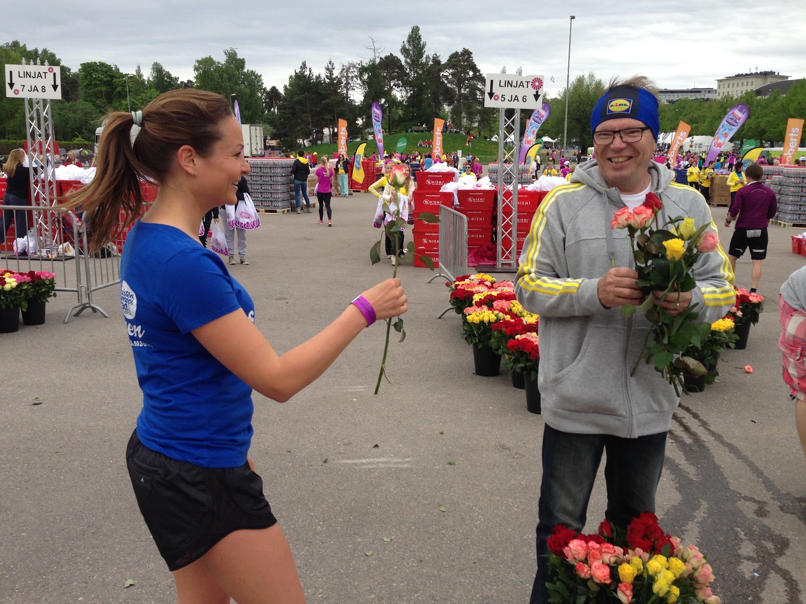 Sunny morning turned to a windy and cloudy day, but it didn’t stop women to run! More than 19 000 women ran 10K today in a special race “Naisten Kymppi” just for women. I was invited by Samsung and it was such a good fun. I was running it with my friend Tanja, and I was motivating her to run her PB- and she did it! I am so happy for her π