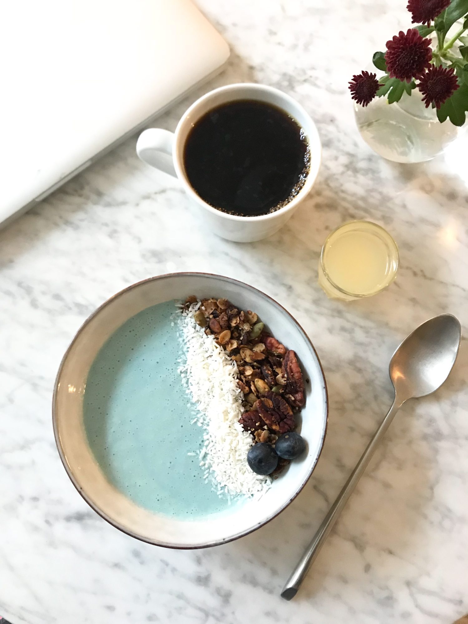 Turkoosi “Pina Bowlada” houkutteli erikoisella värillään, lisäksi tilasin shotin ja kahvin. Smoothiekulho oli oikein herkullinen, muttei se kuitenkaan yksistään riittänyt viemään nälkää. Alla, kun oli jo yksi ohjaus ja edessä vielä muutama ennen lounasta. Avocado toast olisi tämän päälle ollut kuitenkin liikaa… Ääneen pohdiskellessani ystävällinen henkilökunta tarjoitui tekemään puolikkaan avocadoleivän, joka olikin juuri täydellinen lisuke. Viisi tähteä annan siis myös palvelusta. Näin ystävällinen palvelu ei ole aina itsestäänselvyys, siksi tästä tuli oikein erityisen hyvä mieli.