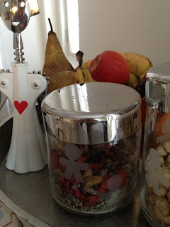 Yritan aina pitaa jaakaapissa kasviksia; kesakurpitsaa, tomaattia, kurkkua, selleria, porkkanaa ja erilaisia salaatteja. Ja poydalla hedelmia; ainakin banaania (smootheja varten), omenaa ja appelsiineja. Niin ja avocadoa (luokitellaan hedelmaksi!) Pakkasessa marjoja; puolukoita, mustikoita ja tyrnia. Naista syntyy aina jotain kivaa, ja viela suht nopeasti! Smootheja ja salaateista saa ruokaisia lisaamalla joukkoon pahkinoita tai juustoja (halloumi, feta, vuohenjuusto, buffalo mozzarella ja raejuusto ovat mun suosikkeja!).
