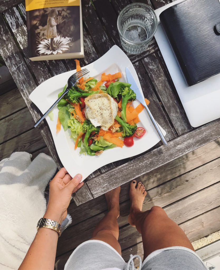 Kesällä ruuanlaitto ei voisi juuri helpompaa olla. Raikkaita salaatteja, hedelmiä ja marjoja löytyy lautaselta päivittäin- joka aterialla. Ne näyttelevätkin lautasellani pääroolia ja vasta sivussa tulevat kala, liha, pähkinät, juusto ja/tai esimerkiksi kvinoa tai riisi. Raskaampia ruokia ei juuri tee edes mieli.