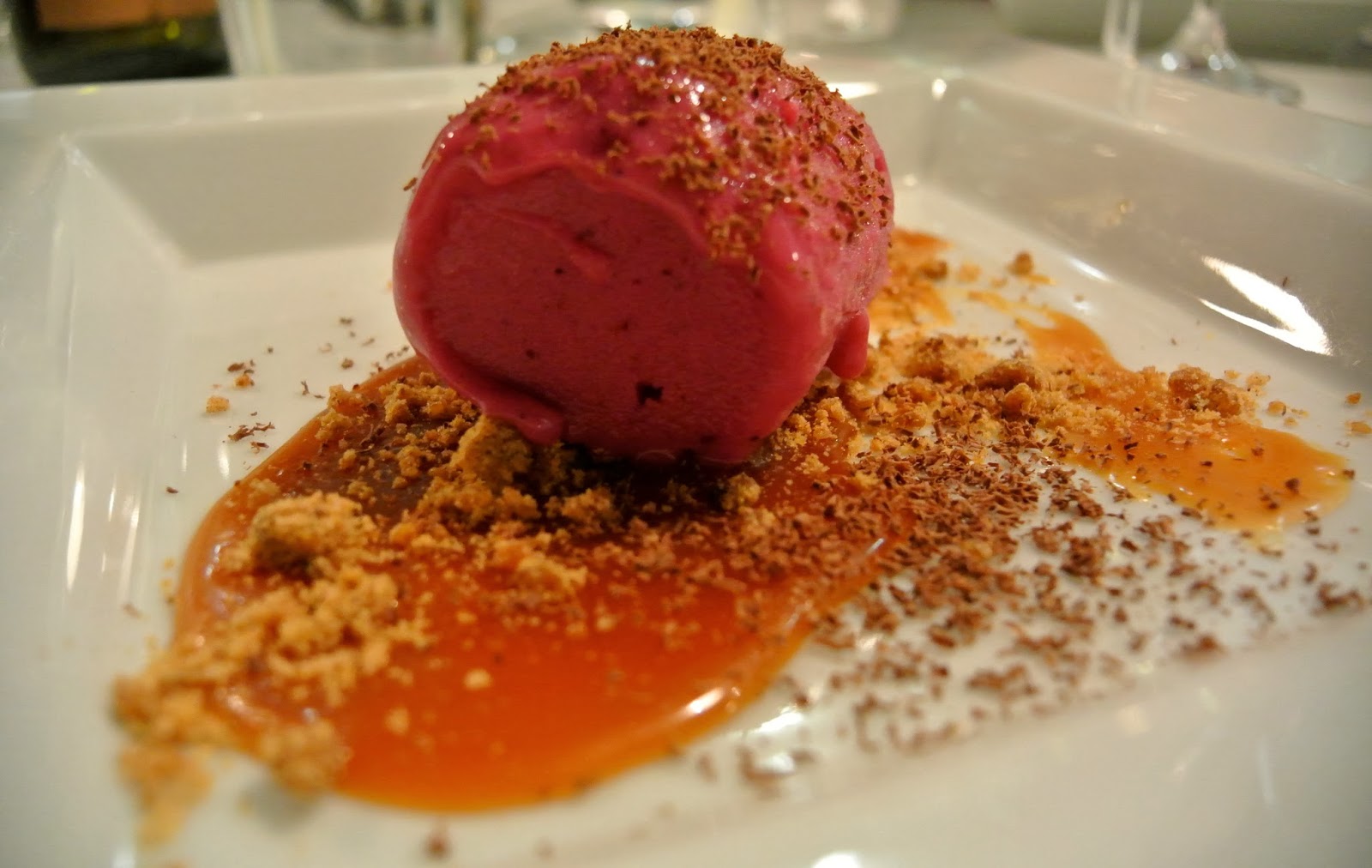 | Dessert: Lingonberry/tofu sorbet with salted caramel sauce |