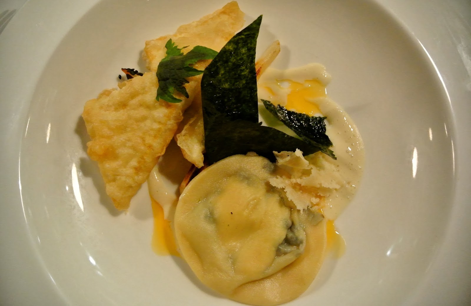 | Main course: Slightly fried tofu, egg foam, mushroom ravioli |