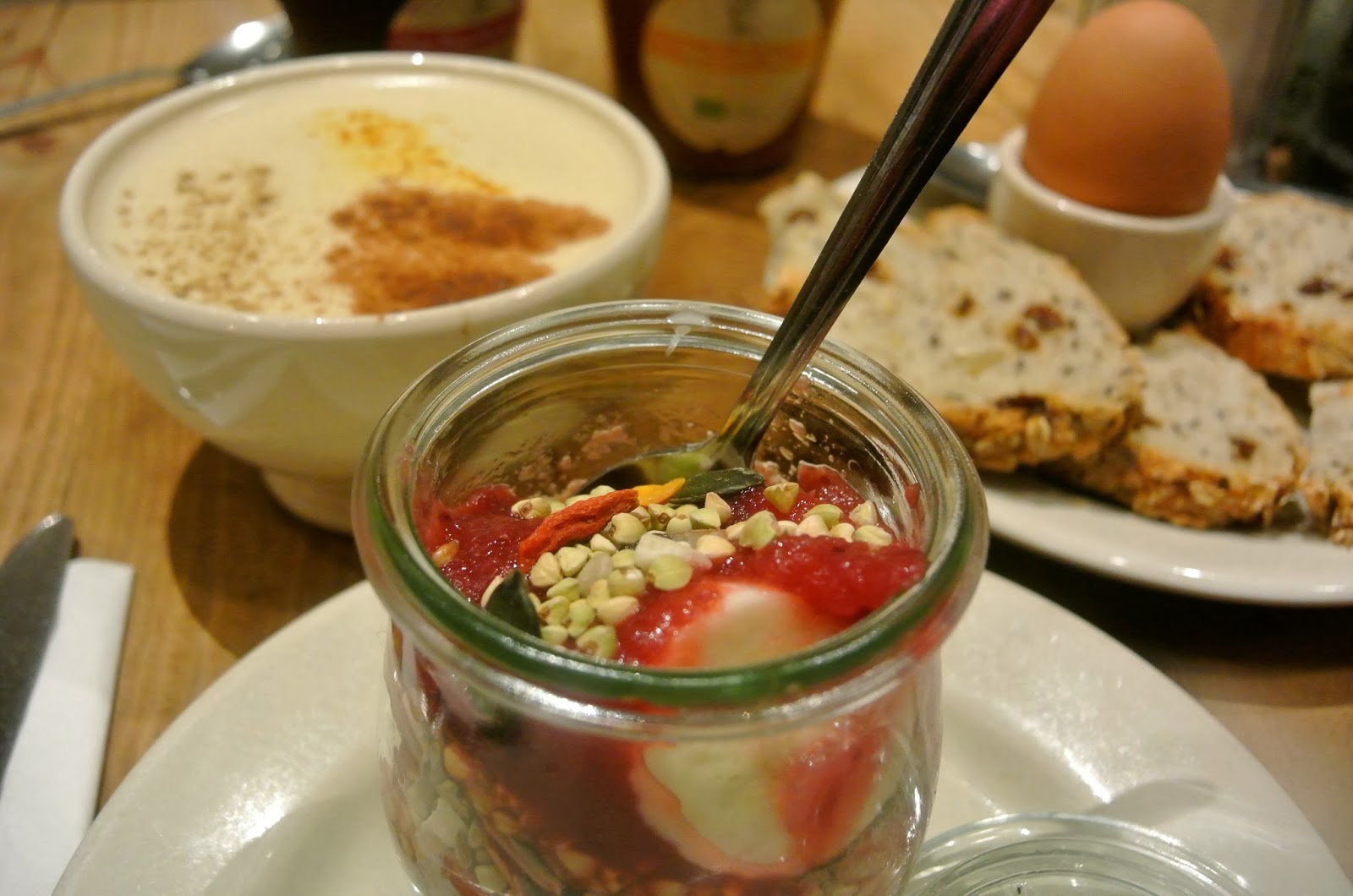 Suosikki aamupalapaikkani jo Amsterdamista. Täältä löytyy aamupalaa/lounasta varmasti joka makuun. Aina munakkaista ja croissanteista raaka chiapuddingiin. Omalle lautaselle tilasin; Chai turmeric, kaneli, soijamaito latten, kookosjugurttia raaka granolan, banaanin & marjojen kanssa, ja kananmunan täysjyväleivän kanssa. Yummy 🙂