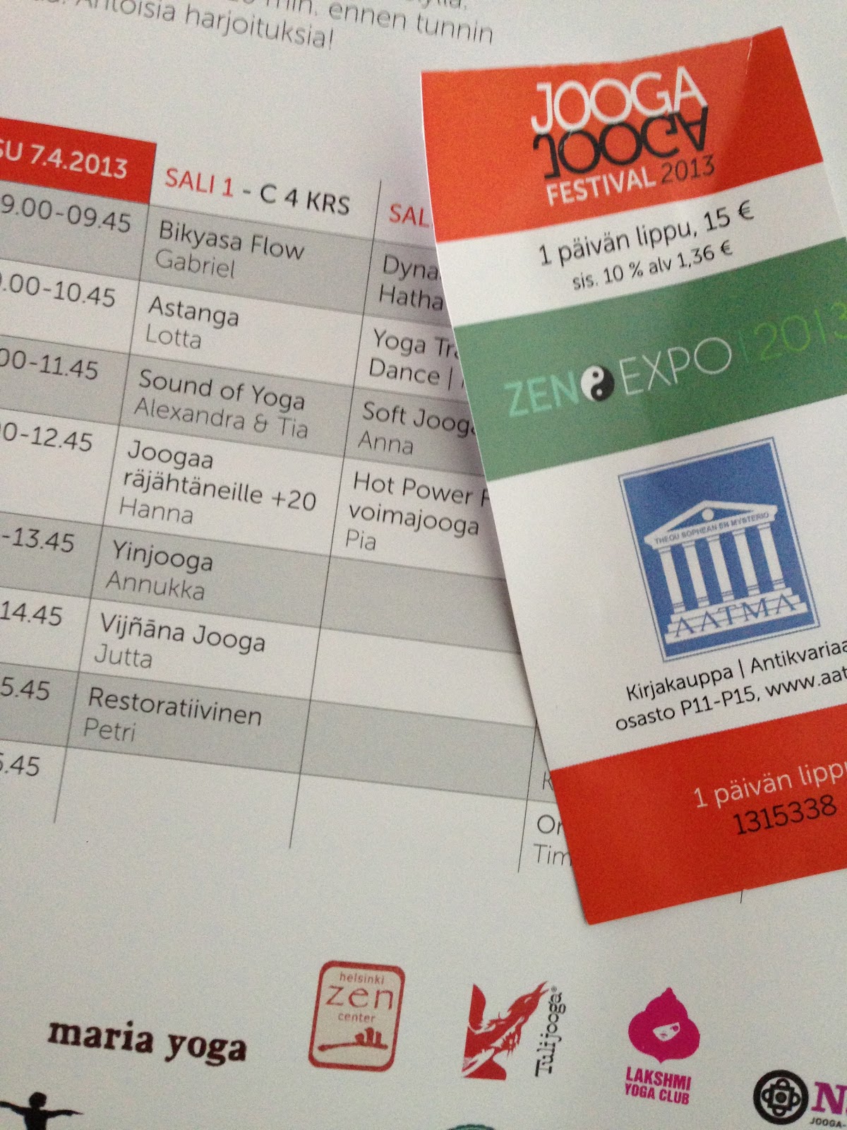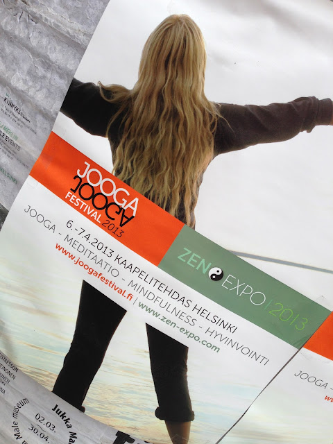 Taman viikonlopun ajan Kaapelitehtaalla vietettiin Joogafestivaalia ja Zen Expoa. Itse en ehtinyt eilen lauantaina paikan paalle, mutta tanaan sitten ehdinkin testata 4 erilaista jooga-tuntia heti aamusta! Paikalla oli yllattavan paljon joogaajia, ja osa tunneista oli aivan taynna.