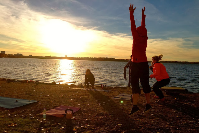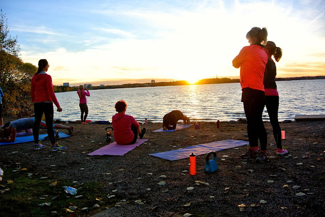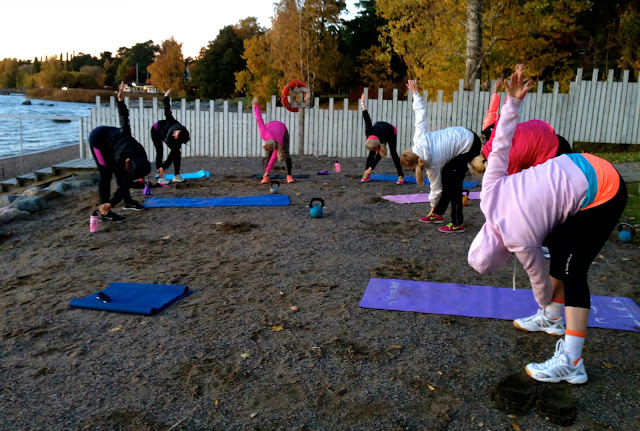 Aivan mieletön auringonlasku… Treenit hiekkarannalla, auringon laskiessa, lokakuussa! Hyvinvointi-ilta alkoi kahvakuulan ja syvävenyttelyn merkeissä Kalastajatorpalla. Parempaa ilmaa ei olisi voinut toivoa, ja miljöö muutenkin oli aivan upea- meren rannassa.