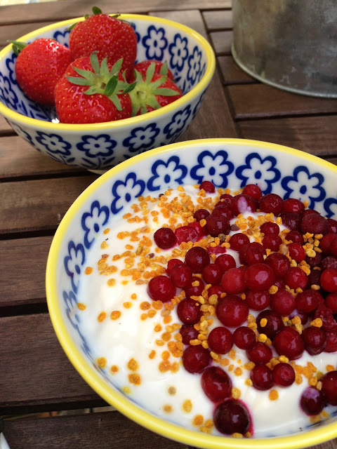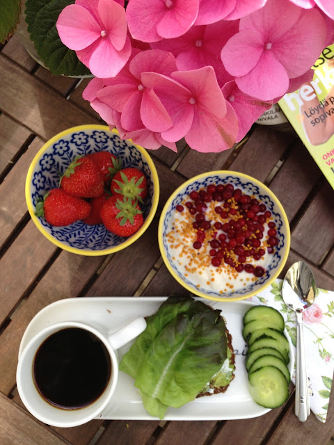 Tanaan piti olla huono ja sateinen saa? Talla hetkella ainakin aurinko paistaa ja nautin sunnuntain aamupalaa terassilla… Perjantaina ostoskoriin paatyi suomalaisia mansikoita ja viela suht kohtuu hinnalla, 3,99e rasia. Viikko sitten sama rasia maksoi 6,99e! Huh, vahan turhan kallista pikku rasiasta.