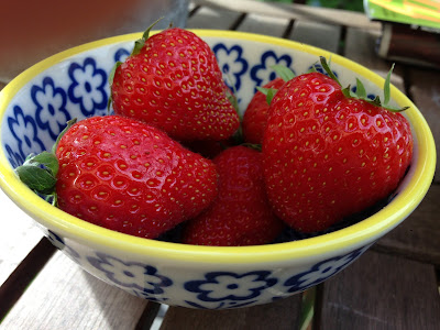 Tanaan piti olla huono ja sateinen saa? Talla hetkella ainakin aurinko paistaa ja nautin sunnuntain aamupalaa terassilla… Perjantaina ostoskoriin paatyi suomalaisia mansikoita ja viela suht kohtuu hinnalla, 3,99e rasia. Viikko sitten sama rasia maksoi 6,99e! Huh, vahan turhan kallista pikku rasiasta.