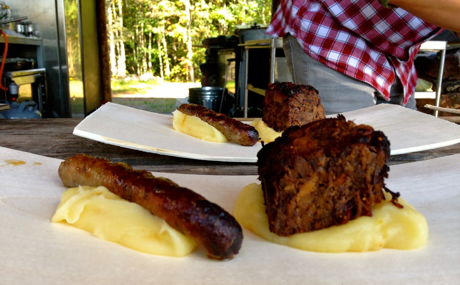 Villisika rillette tarjoiltiin palsternakkapyreen ja villisika aurinkokuivattutomaatti/parmesan makkaran kanssa. En edes muista minä vuonna olen viimeksi syönyt makkaraa… mutta täytyy kyllä myöntää, että tämä oli hyvää. Ja niin luomua lähiruokaa kuin olla ja voi.