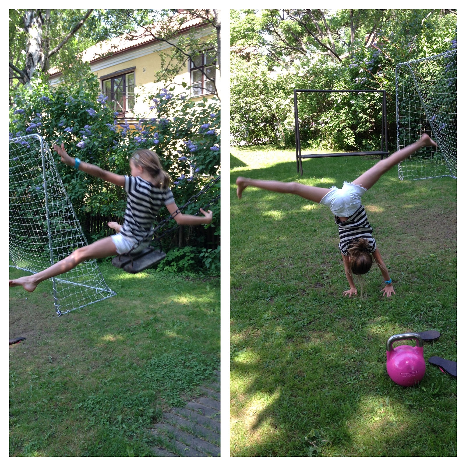 Kesalla on kiva treenata ulkona. Ainakin juoksua ja kahvakuulaa voi treenata aikaan ja paikkaan katsomatta. Pari paivaa sitten treenattiin tyttaren kanssa kotipihassa. Aiti/lapsijumppaa πŸ™‚