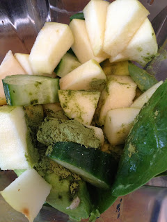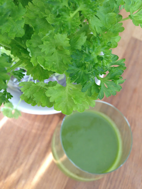 Eilen tein tosi raikasta vihersmoothia sellerista, kurkusta, romaine salaatista, pinaatista, avocadosta, omenasta, paarynasta ja sitruunasta + ripaus suolaa, reilu tl ohranorasjauhetta ja vetta. Tasta tuli iso lasipullollinen, josta riittaa noin kolmeksi kerraksi. Nama smoothiet sailyvat jaakaapissa kaksi paivaa.