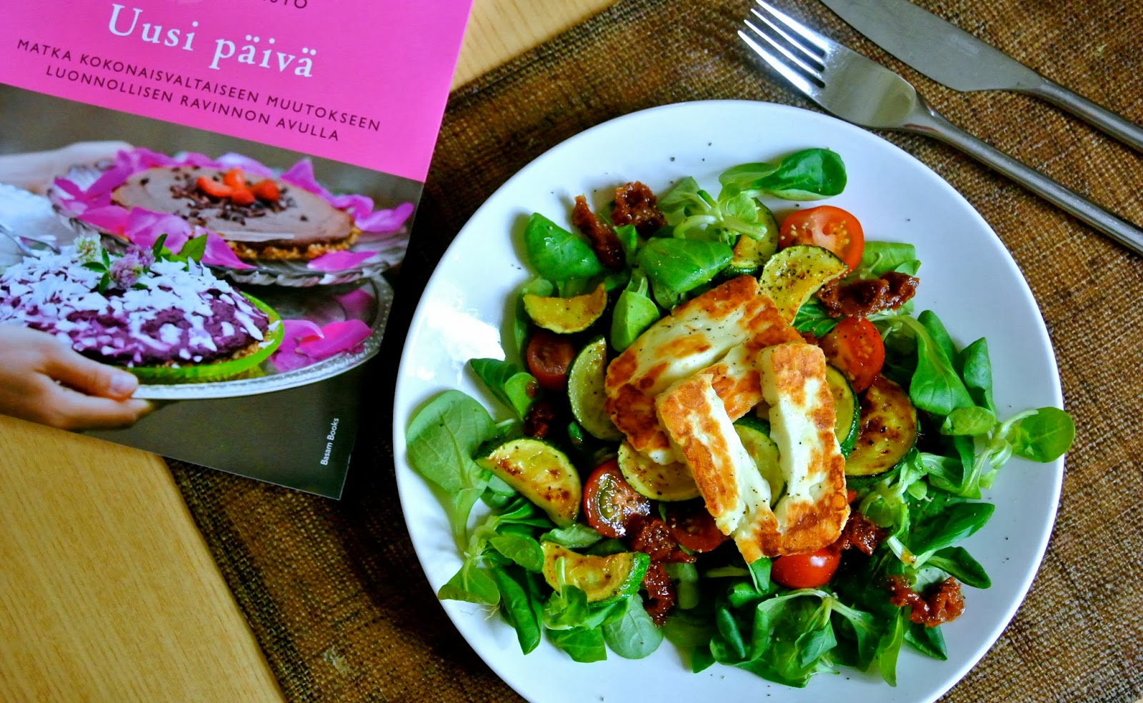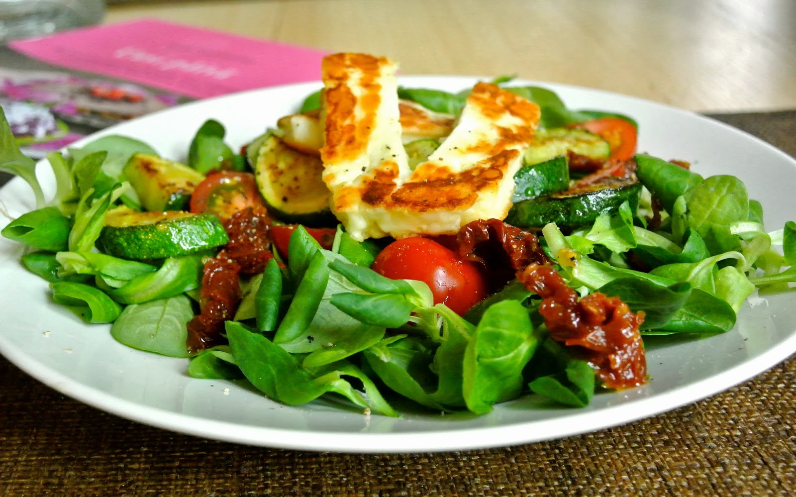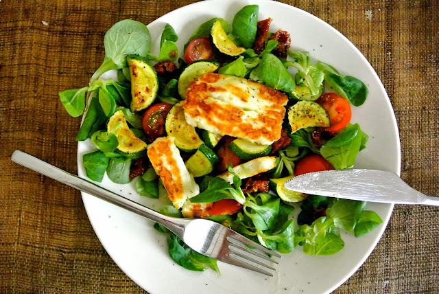 Paista kesäkurpitsapaloja ja halloumisiivuja ( pilkoin 2 noin sentin paksuista juustosiivua) kevyesti oliiviöljytyllä pannulla muutama minuutti. Kasaa salaatin päälle tomaatit ja grillatut kesäkurpitsat & halloumi. Ripottele päälle hieman mustapippuria. Enjoy. Helppoa ja hyvää 🙂