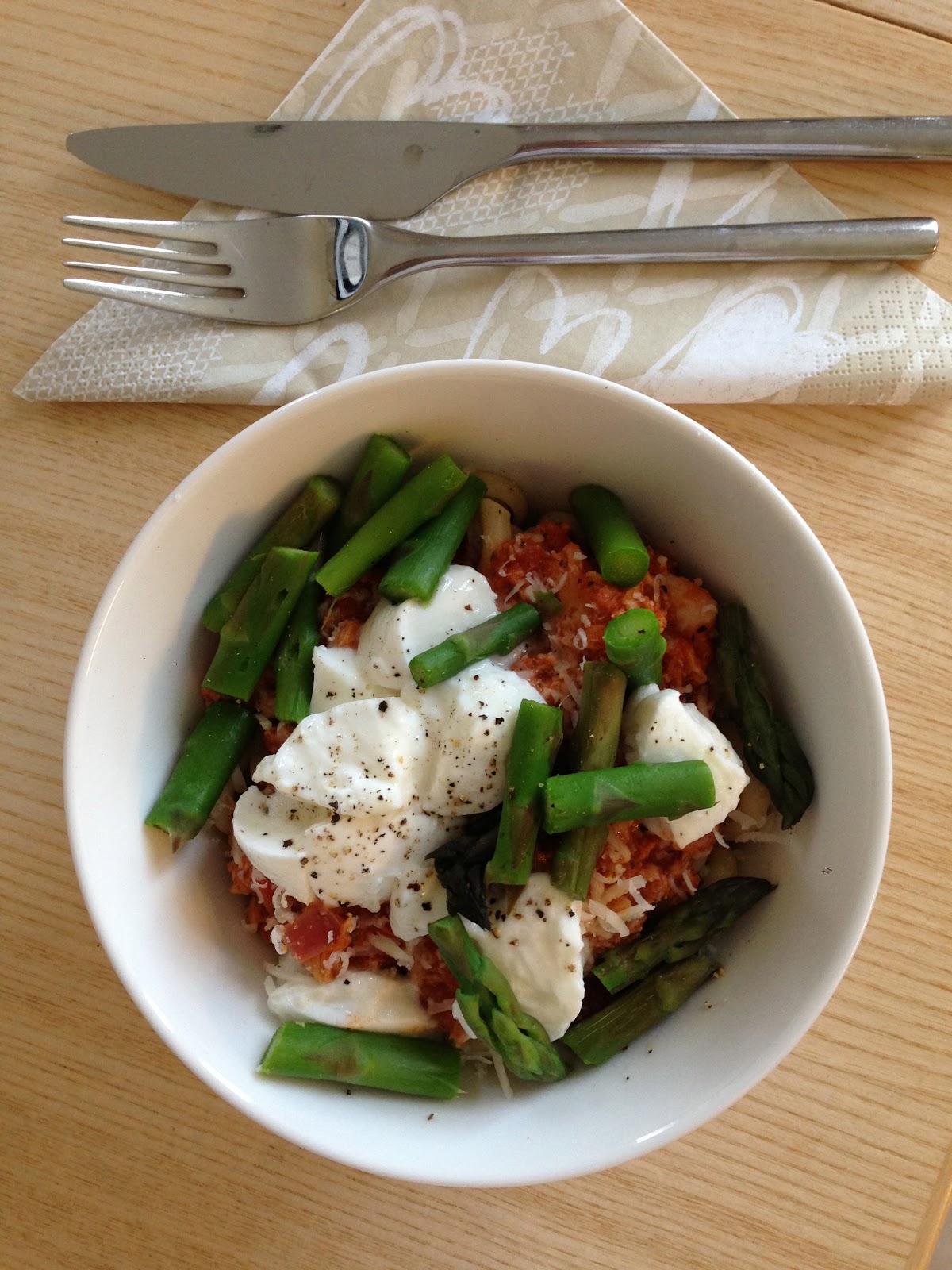 Paivan Dinner: Taysjyvapastaa “homemade” tomaattikastikkeella parsan ja mozzarellan kera π