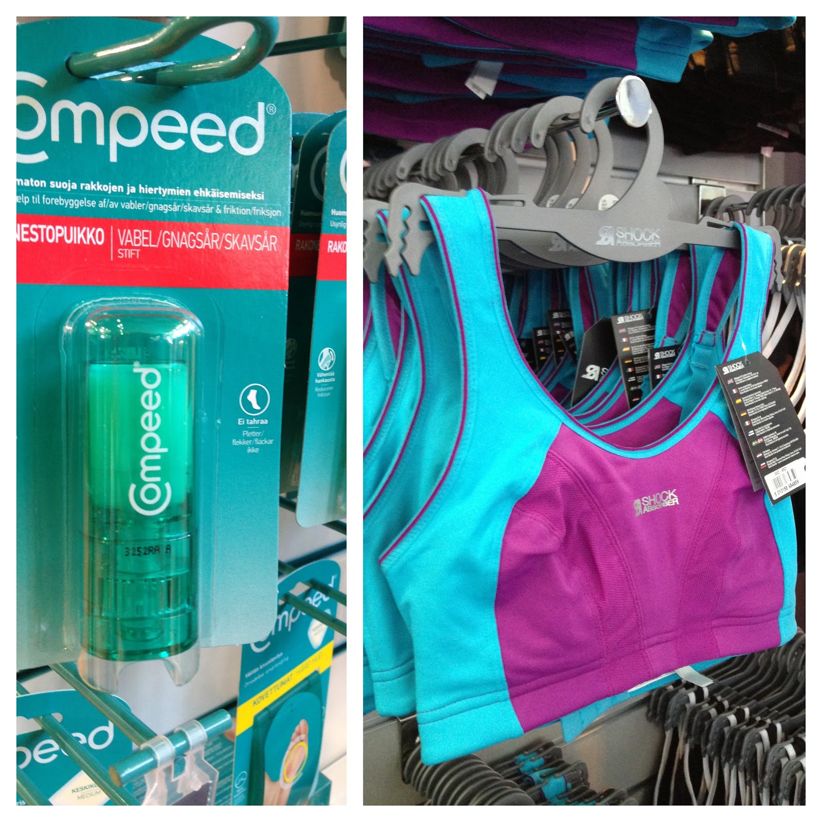 Taman Compeedin rakonestopuikon ostin hiertymien ehkaisemiseksi. Tama ei tahraa eika jaa rasvaiseksi iholle niin kuin vaseliini, ja siksi ostin tata. Huomenna aion laittaa tata kainaloihin ja liivien rajaan. Ja hei naiset! Satsatkaa myos kunnon urheiluliiveihin, ne ovat vahintaan yhta tarkeat kuin kunnon lenkkarit! Kisiksella oli myynnissa myos Shock
