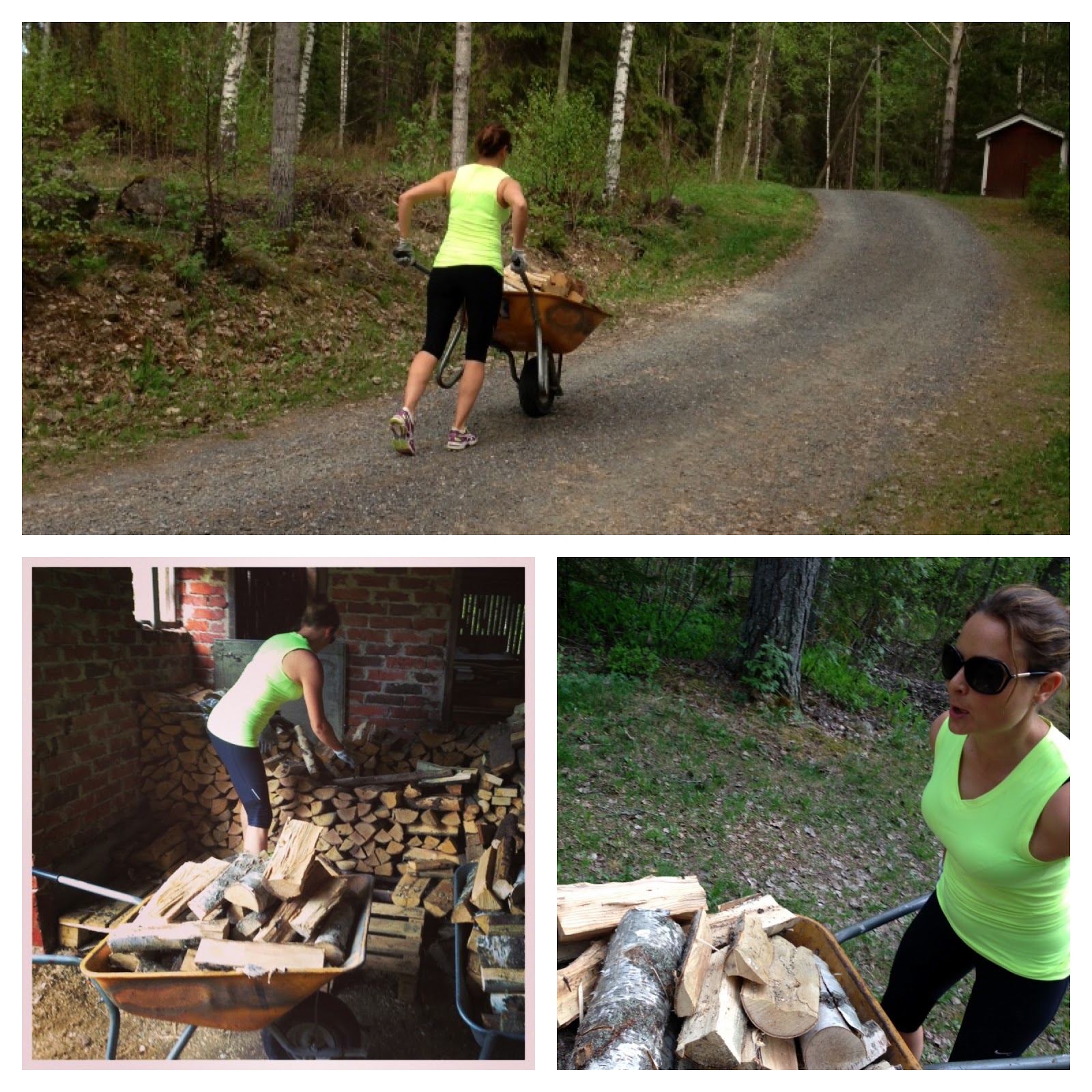 Parin tunnin reipas kokovartalotreeni sujuu nainkin… Halkoja kottikarryihin, 400 metria karryntyontoa (ylamakea) seuraavaan pisteeseen ja sitten halot pinoon uuteen kasaan! Ja taas sama alusta… Huh, hyotyliikunta kunniaan!