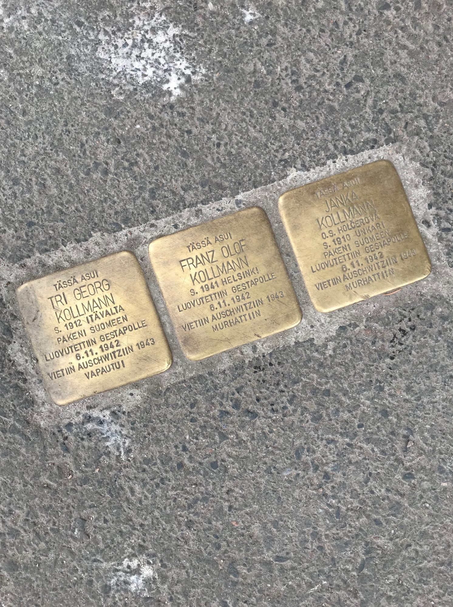 Pitkälle emme kaupunkikierroksellamme päässeet, kun eteen tuli jo ensimmäinen muistomerkki- Munkkiniemen Puistotielle upotetut kolme messinkilaattaa, jotka ovat Suomen ensimmäiset “kompastuskivet”. Kompastuskivet ovat osa kansallissosialismin uhreille ympäri Eurooppaa pystytettyjen muistomerkkien verkostoa, jonka tarkoituksena on tuoda uhrien muisto näkyviin eri paikoille, joissa he viimeksi elivät vapaudessa ja joista heidän kuolemaansa johtaneet rikokset alkoivat. Suomi luovutti natsi-Saksalle jatkosodan aikana vähintään kahdeksan juutalaispakolaista, joiden joukossa oli mm. Kollmannien perhe.