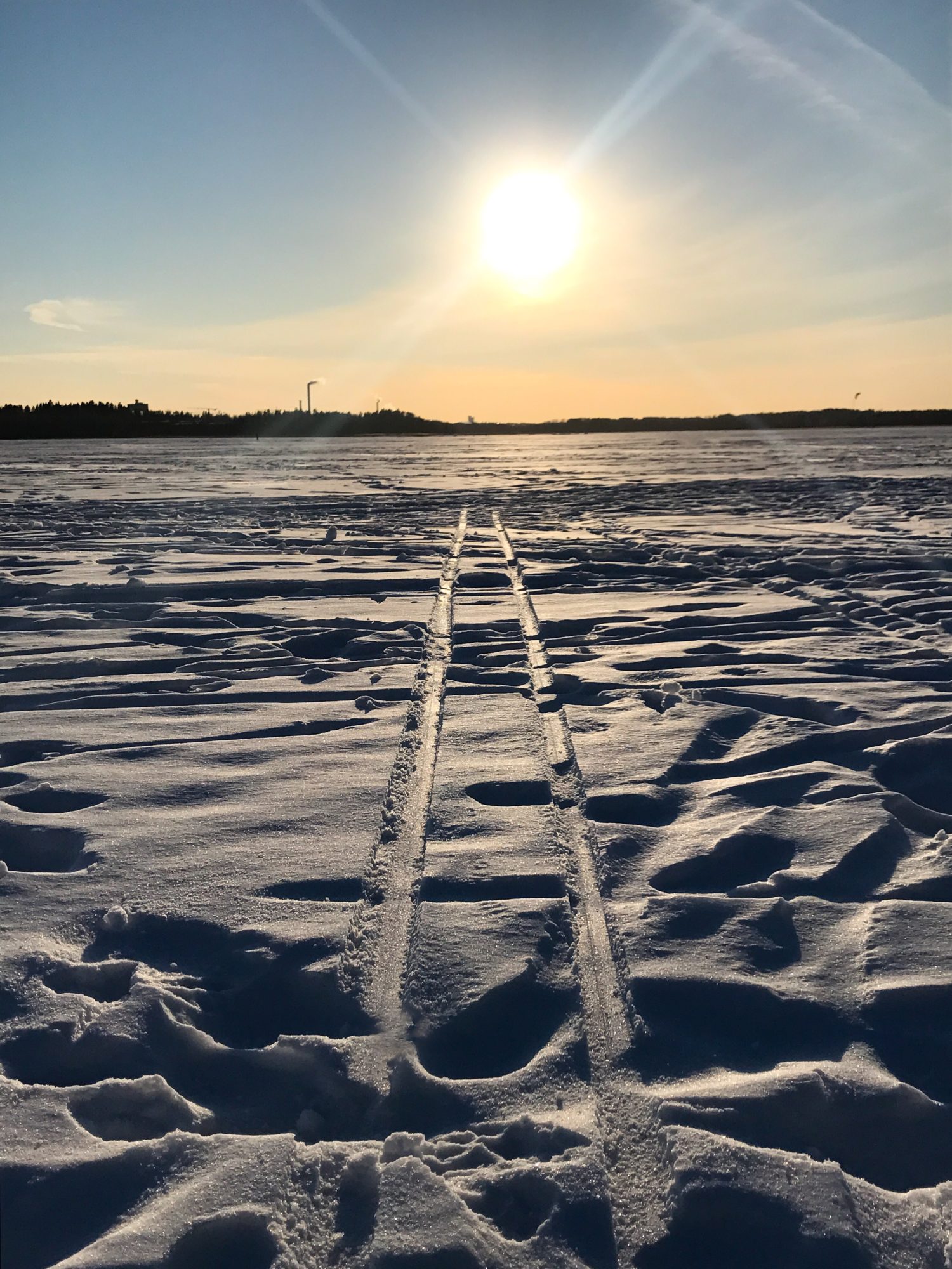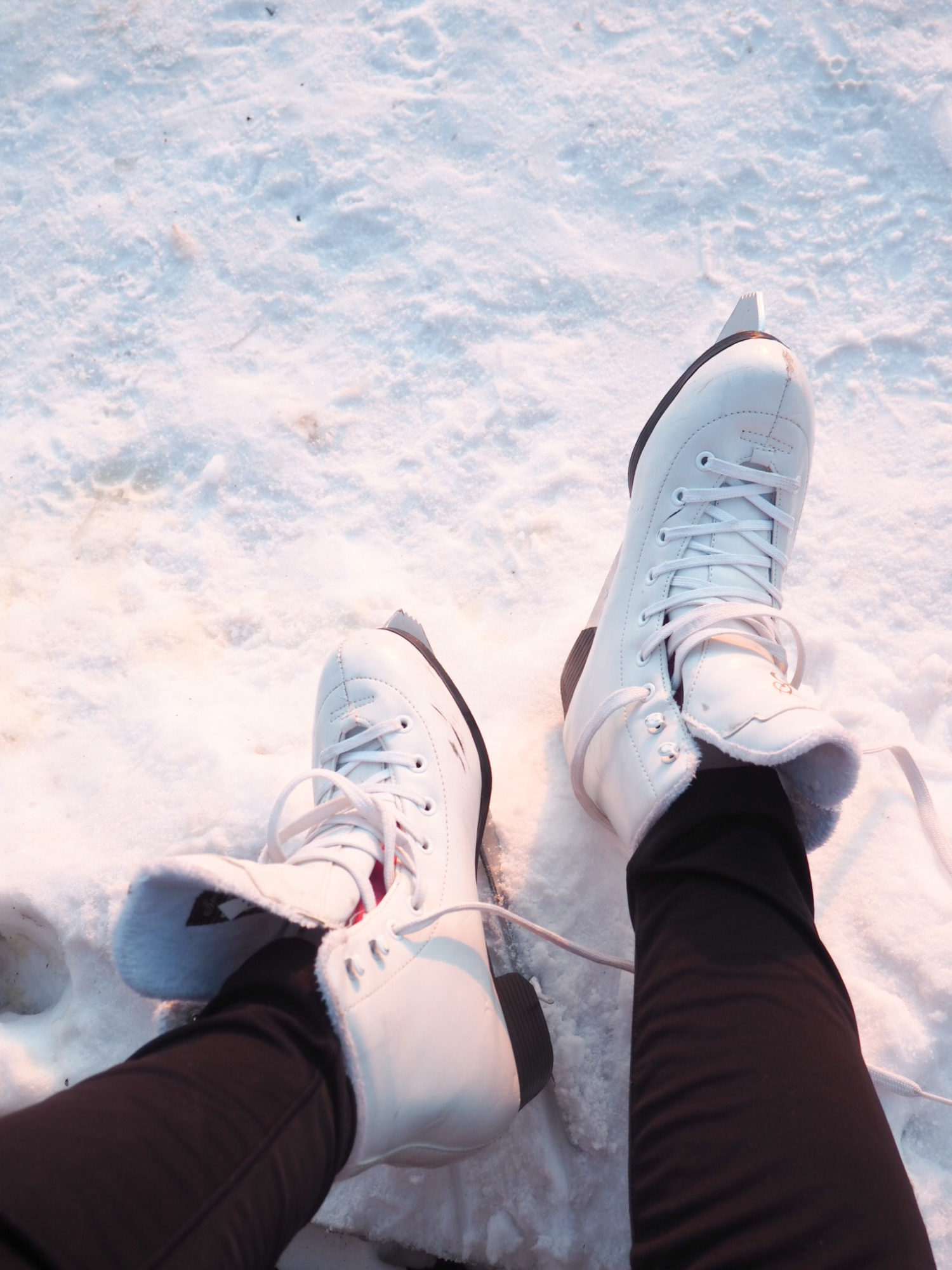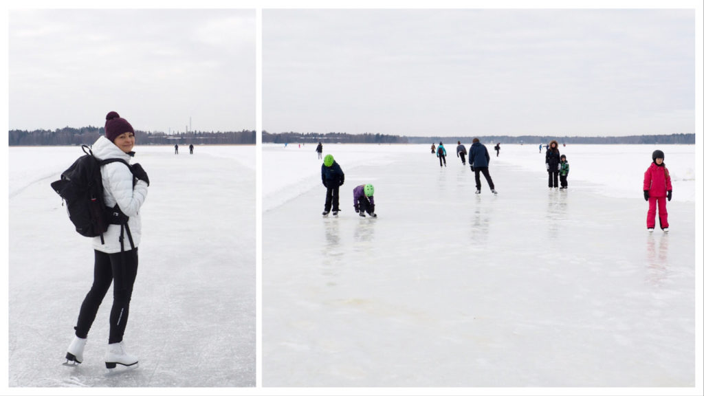 Matkaluistelussa olisi tietenkin mukava, kun alla olisi oikein retkiluistimet. Röpelöisen jään takia huomasin, että jännitin nilkkoja ja kaunokkien terien takia nostin koko ajan varpaita hieman ylöspäin ettei terä tökkäisisi. Aivan kaatumatta en kuitenkaan selvinnyt- komea pesäpallosyöksy suoraan vatsalleen. Onneksi sain syöksyssä nostettua polvet irti jäästä eikä mustelmia kummempaa sattunut.