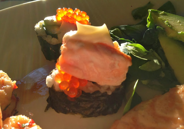 Eilen aurinko paistoi aivan ihanasti- niin kuin nytkin, juuri ennen lähestyvää myrskyä. Lounaaksi maistui perjantai-illan left over sushit. Kaverina kevyesti grillattua lohta ja thairapuja. Oli hyvää 🙂