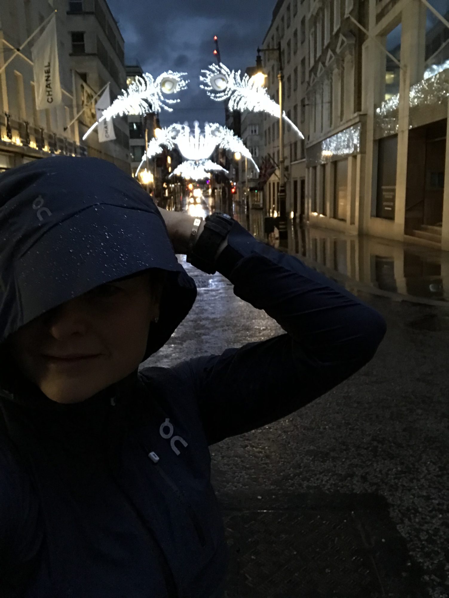 Harmaata ja sateista on ollut täällä Lontoossakin. Vettä on tullut eilisestä iltapäivästä lähtien kuin aisaa, onneksi otin sadetakin ja sateenvarjot mukaan. Aamulenkille lähdin kuitenkin sateesta huolimatta. Kastuin läpimäräksi aina alusvaatteita myöden, mutta ai että nautin hiljaisilla kaduilla juoksemisesta. Muuten kiireinen Oxford Streetkin tuntui mukavan rauhalliselta.