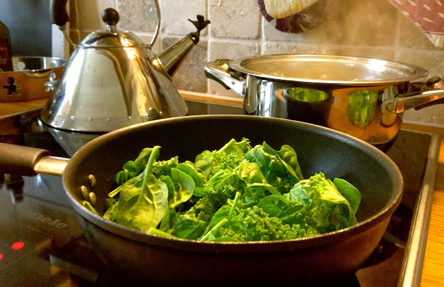 Reissun jälkeen ruokakaapit usein ammoittavat tyhjyyttään. Onneksi hyvinvointi-illasta jääneet lehtikaali ja pinaatti olivat vielä säilyneet hyvinä. Niiden ympärille kehittelin nopean lounaan.
