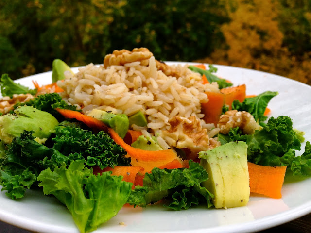 Pyöräytä pesty ja revitty lehtikaali sekä baby pinaatti nopeasti pannulla oliiviöljyn kanssa- vain muutama minuutti, niin että lehtikaali pehmenee. Keitä täysjyväriisi ohjeen mukaan. Asettele lautaselle vihreät, porkkanasuikaleita, avocadoa, täysjyväriisiä ja pähkinöitä (käytin tässä saksanpähkinöitä). Mausta oman maun mukaan. Tässä vain mustapippuria. Enjoy!