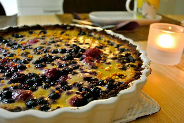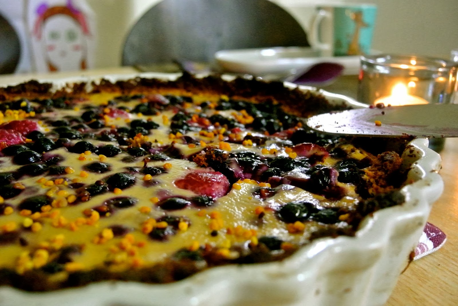 1. Vatkaa huoneenlämpöinen voi ja sokeri vaahdoksi. 2. Lisää seokseen muna ja kuiva-aineet. 3. Voitele vuoka ja levitä taikina. 4. Paista pohjaa 200c uunissa alatasolla noin 10 minuuttia (kannattaa vuorata reunat alumiinifoliolla. Näin reunat eivät  lähde “valumaan”. 5. Sekoita täytteen aineet keskenään. 6. Levitä marjat ja täyte piirakan päälle (muista ottaa foliot pois!) ja paista uunissa 200c noin 30minuuttia. Valmiin piirakan päälle ripottelin vielä mehiläisen siitepölyrakeita.