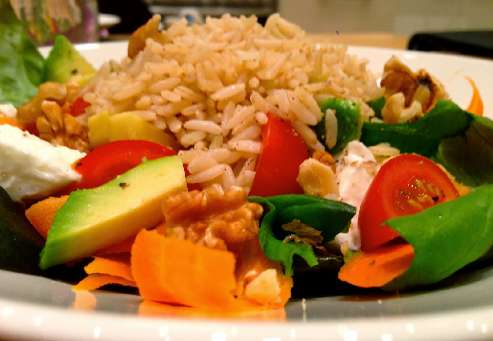 In the evening I had a huge salad with salad, tomatoes, carrot, avocado, walnuts, Buffalo mozzarella and whole grain rice.