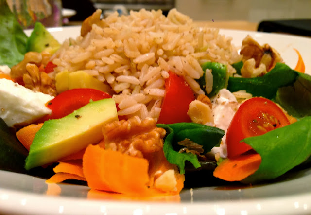 Illalla tein ison ruokaisan salaatin (salanovasalaattia, tomaattia, porkkanaa, avocadoa, saksanpähkinää, Buffalo mozzarellaa ja täysjyväriisiä).