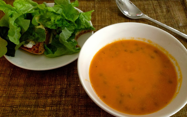Lounaaksi maistui eilinen linssi/porkkana/bataattikeitto ja täysjyväleipäpala salaatilla, avocadolla ja vuohenjuustolla. Linssit ovat erinomainen proteiinin ja hyvien rasvojen lähde. Välipalaksi salitreenin ja treenattavan välissä tein ison mansikkaisen proteiinismoothien.