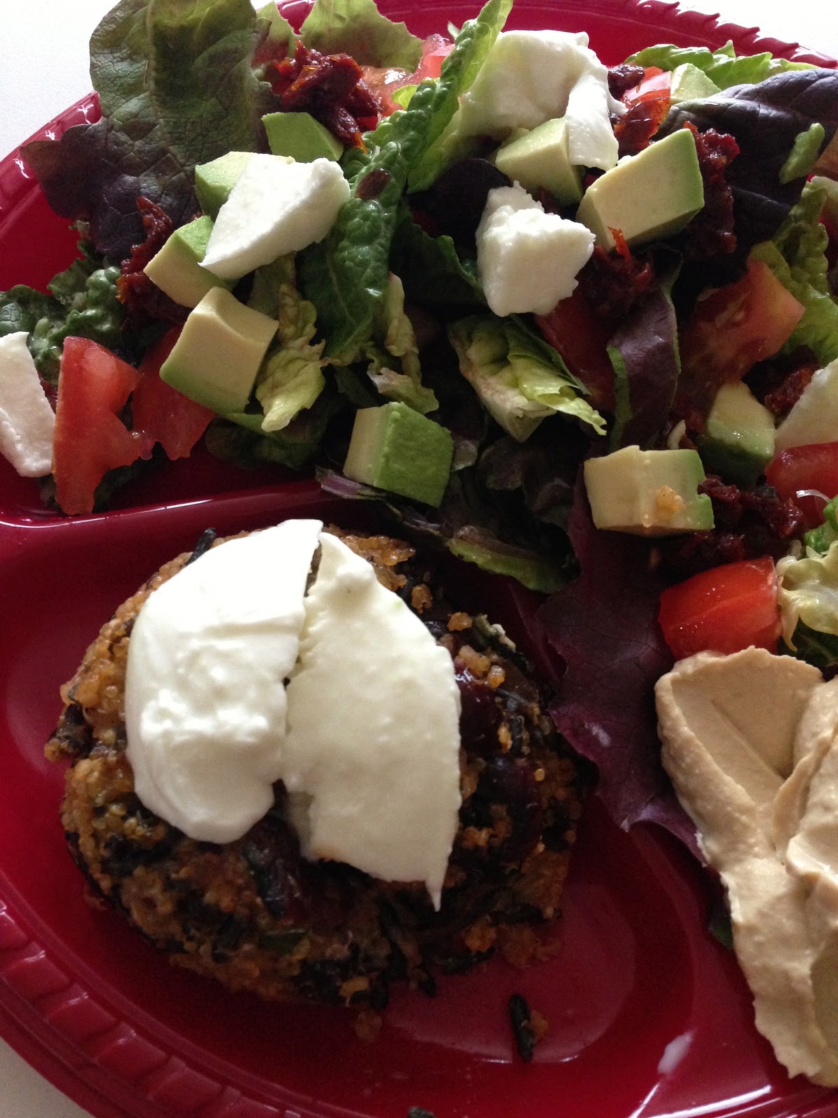 | Ja salaattia “kvinoa/bataatti -pihvin” ja mozzarellan kanssa …sivussa vahan hummusta! |