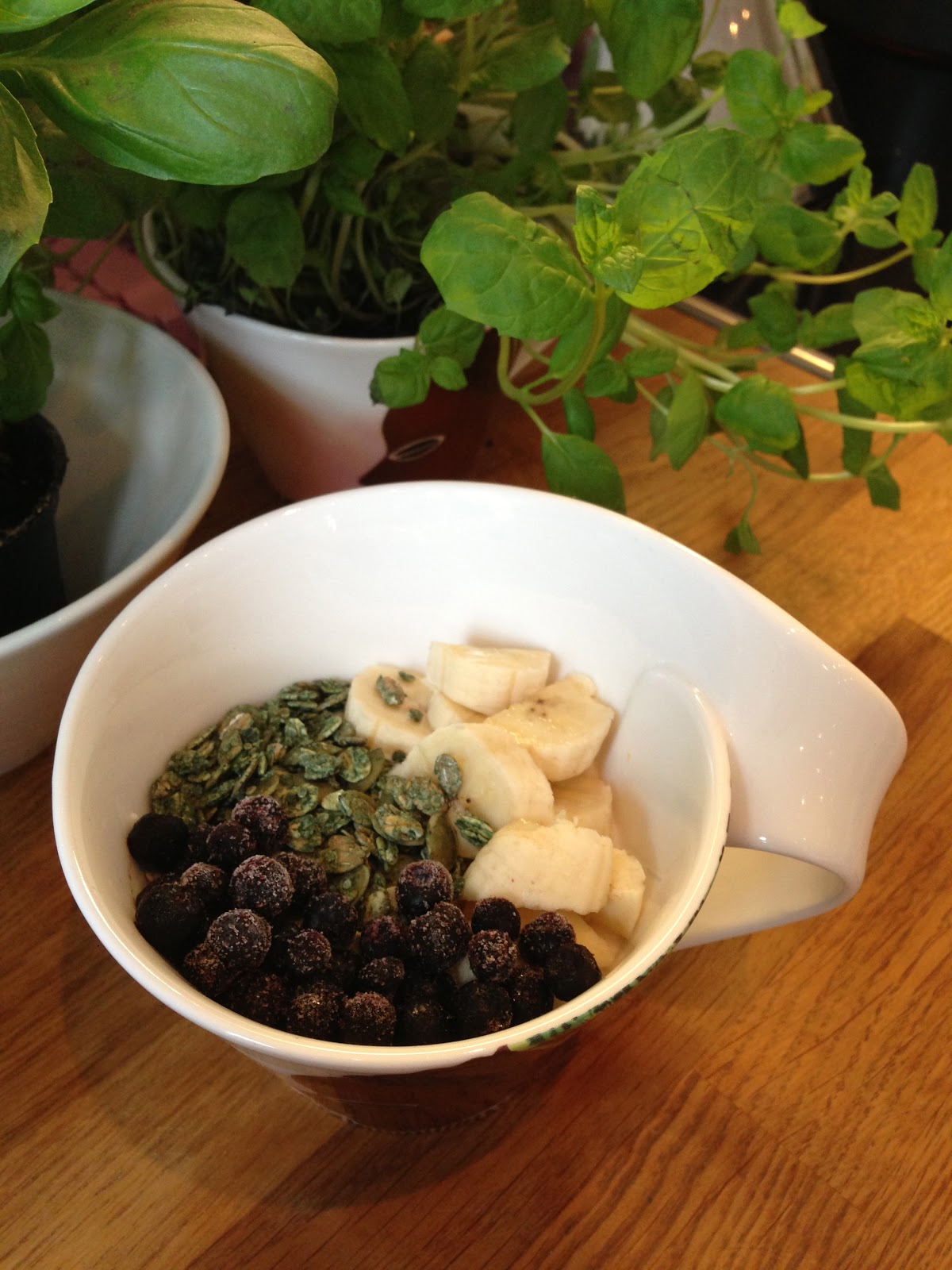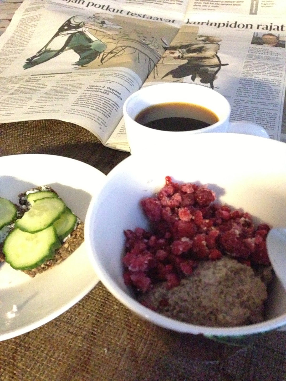 Aamupala puoli seitseman maissa oli sama kuin viikonlopulla eli banaani/chiapuddingia vadelmilla ja gluteeniton porkkanakrakkeri kurkulla ja vuohenjuustolla. Valipalana kymmenen jalkeen soin appelsiinin.