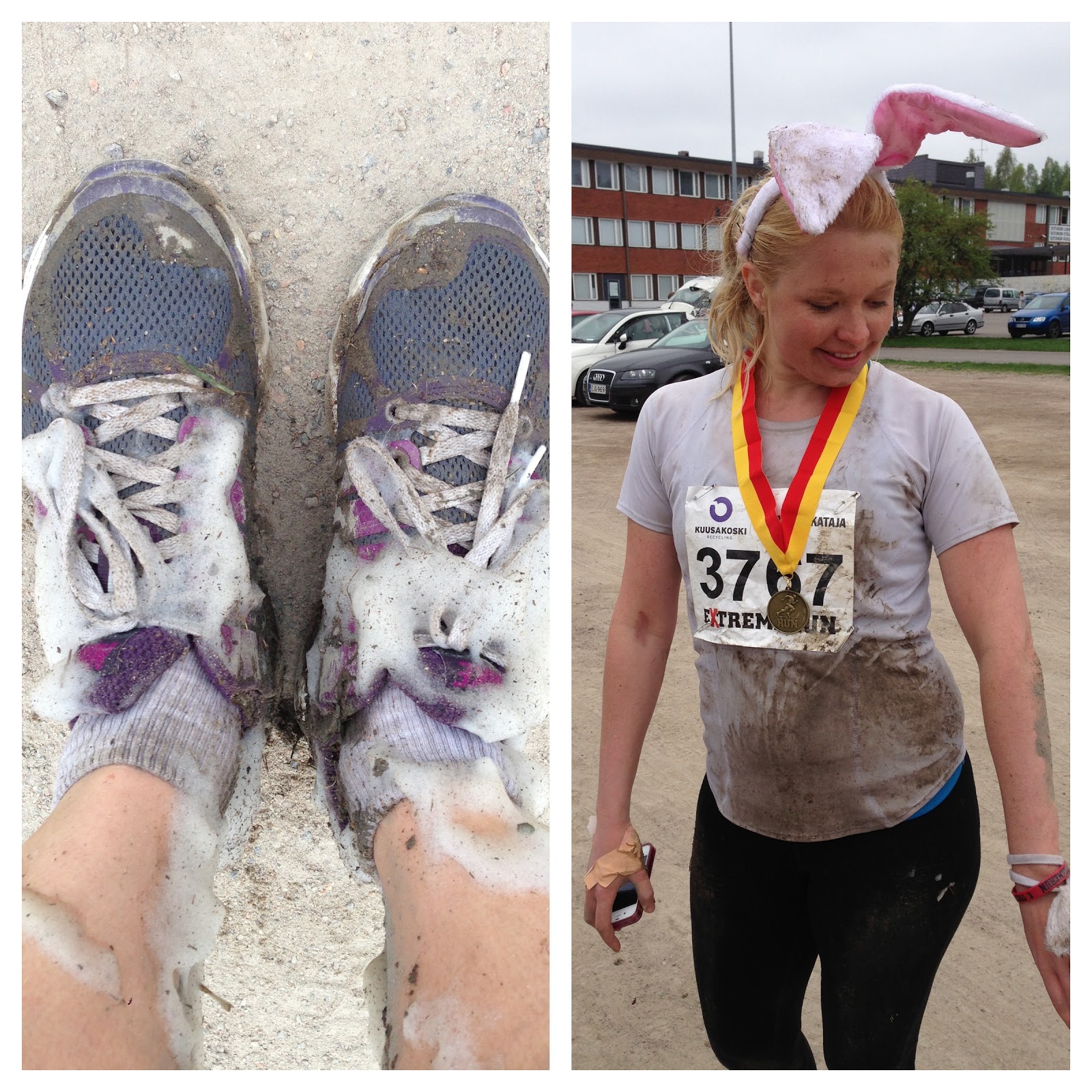 Ihan mieleton paiva takana! Mukaan 18km matkalle mahtui niin kiipeilya, heinapaaleja, esteita, mutaryomintaa, joen yli uintia ja vaikka mita… Vesi oli yllattavan kylmaa, ja varsinkin ensimmaisella kierroksella tuli jo oikein vilu, kun uinnin jalkeiselle esteelle kertyi ruuhkaa. Onneksi oli vanhat kamat paalla, sen verran mutaista oli touhu. Lenkkarit ja sukat heitin suosiolla lahimpaan roskakoriin.