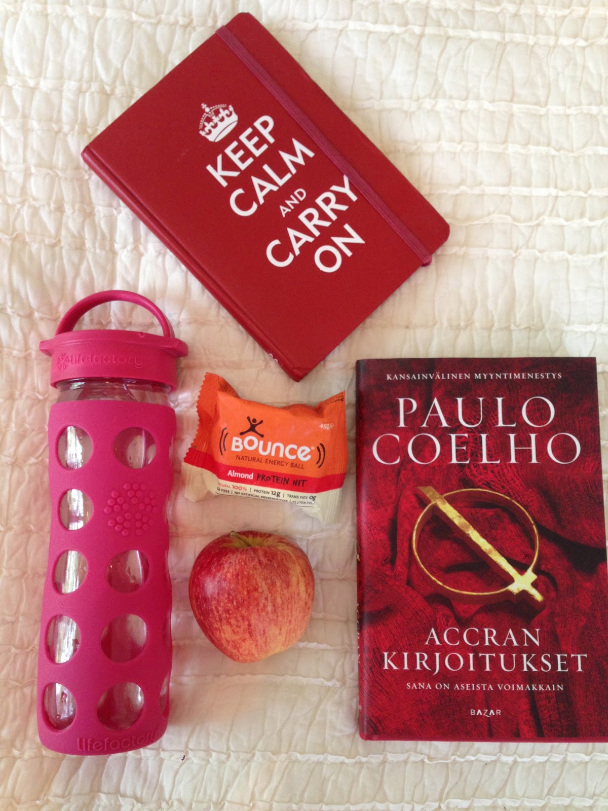 On the go again! These are the things I carry in my handbag; a bottle of water (a must!), an apple, Bounce ball, if I fancy something to eat (this almond one is my favorite one!), Paulo Coelho’s newest book and a diary. Ready to go. 4 days of relaxing and enjoying my daughter, friends, beach and the sun 🙂 See you later!