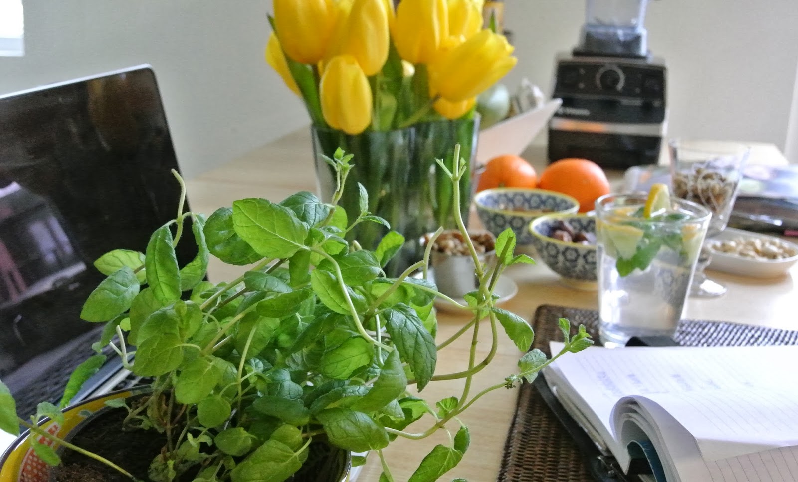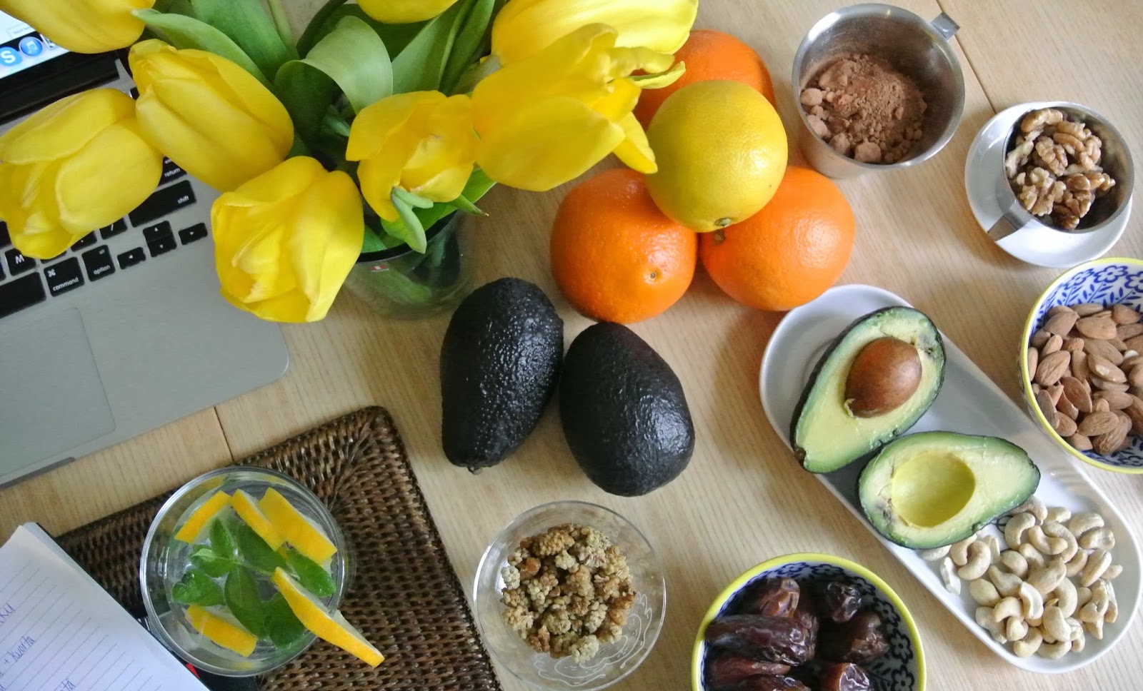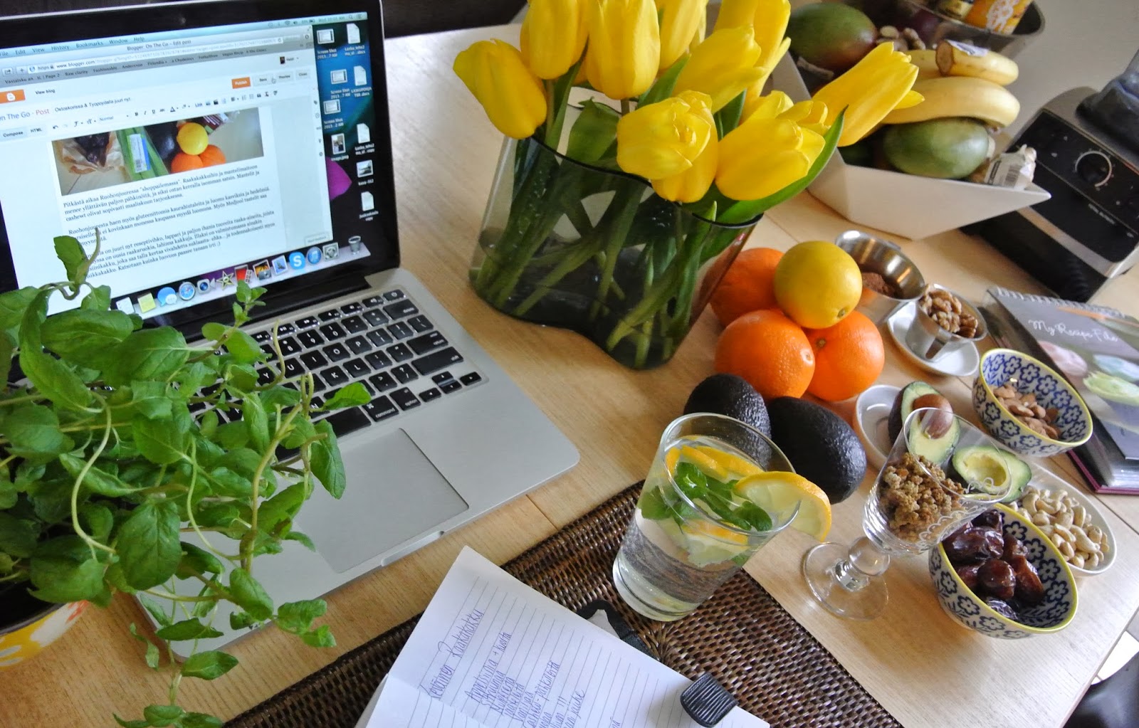 Työpöydällä on juuri nyt reseptivihko, läppäri ja paljon ihania tuoreita raaka-aineita, joista kehittelyssä on uusia raakaruokia, lähinnä kakkuja. Illaksi on valmistumassa ainakin appelsiinikakku, joka saa tällä kertaa vivahdetta suklaasta- ehkä… ja todennäköisesti myös mansikkakakku. Katsotaan kuinka luovuus pääsee tänään irti 🙂 Viikonlopun appelsiini/mulperikakun resepti on viittä vaille valmis eli pian myös täällä 🙂
