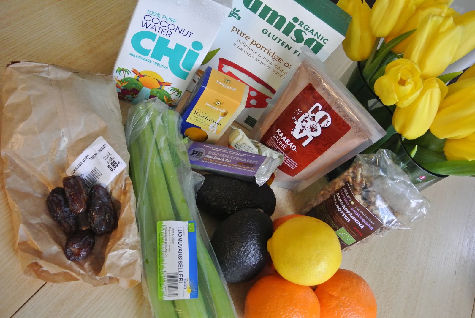 Ruohonjuuresta haen myös gluteenittomia kaurahiutaleita ja luomu kasviksia ja hedelmiä. Varsiselleriä ei kovinkaan monessa kaupassa myydä luomuna. Myös Medjool taatelit saa irtomyynnistä.