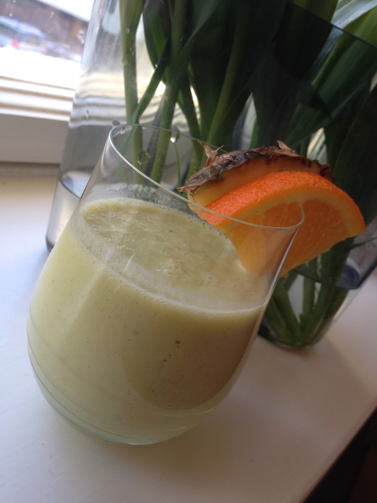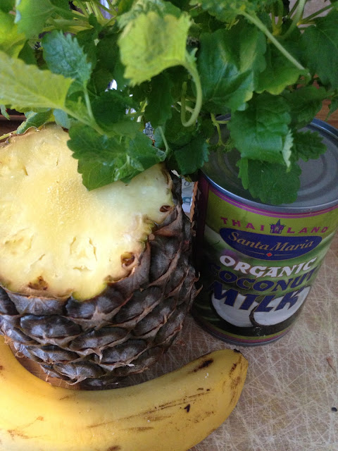 | 1/2 Pineapple, 1 Banana, 1/2 Orange, 1/2 can of Coconut Milk and some fresh Mint |
