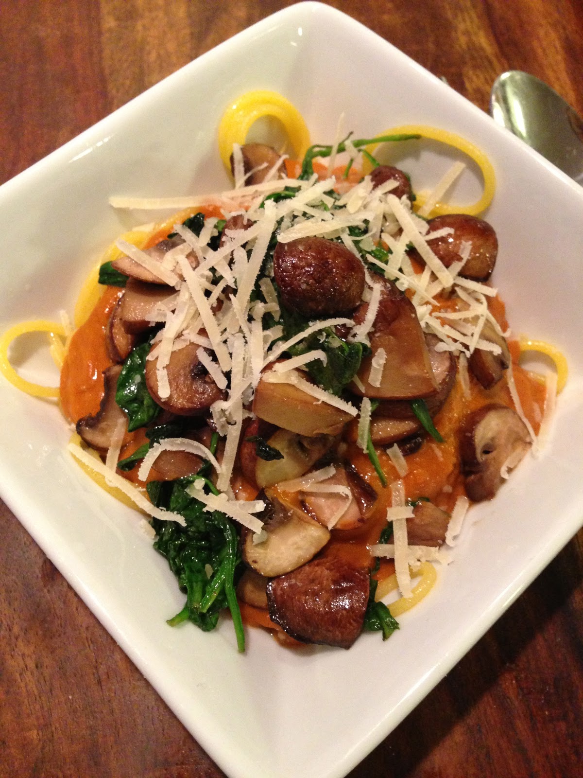| Paivan paatteeksi gluteenitonta pastaa, sienien, pinaatin, tomaattikastikkeen ja parmesanin kera… |