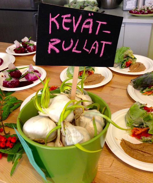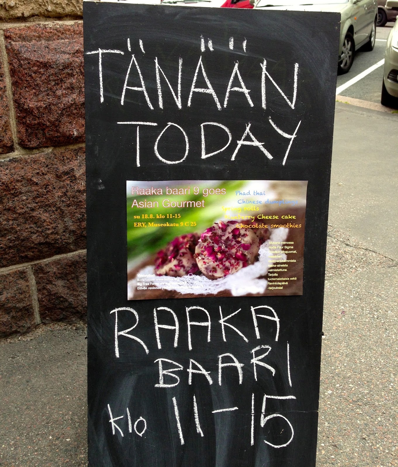 Ihan sattumalta bongasin aamulla Facebookista ilmoituksen ” Raaka Baari 9 goes Asian Gourmet”, joka oli siis auki vain tänään kello 11-15. Onneksi olo oli jo sen verran hyvä, että lähdettiin heti 11 jälkeen tyttären kanssa brunssille. Tarjolla oli kevätkääryleitä, mykkyjä, pad thaita, juustokakkua ja mustikkapiirakkaa. Mmmmm… Kaikki näytti niin hyvältä! Ja koska emme osanneet päättää mitä syödä, niin tilasimme vähän kaikkea 🙂 Oma suosikkini oli mykyt ja tyttären kevätrullat, jota haettiin vielä toinen annos. Pad Thai säästettiin illaksi.