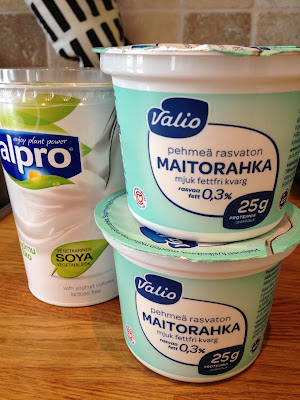 Taalla Suomessa olen kuitenkin pikku hiljaa lisannyt rahkan ja raejuuston takaisin ruokavaliooni, eika mitaan oireita ole ilmaantunut. Syyna lisaamiseen on ollut ihan vain halu testata erilaisia vaihtoehtoja aamupaloille/valipaloille. Mistaan ylettomista maarista ei kuitenkaan ole kyse, vaan rahkaa menee yleensa aamupalana tai valipalana, ja raejuustoa silloin talloin lisukkeena. Rahka-aamupala on nopea tehda ja se sulaa nopeasti. Valion valkoinen rahka on suosikkini, mutta sita ei valitettavasti loydy ihan joka kaupasta! Se on rasvaisempaa kuin muut rahkat, mutta sokerimaarat ovat samat kuin rasvattomissakin. Koostumukseltaan se on vahan turhan paksua ja siksi sekoitankin sita vaikka Alpro Soijan jugurttiin. Muuten maitotuotteista kaytan juustoja; lahinna fetaa, vuohenjuustoa ja mozzarellaa salaatteihin.