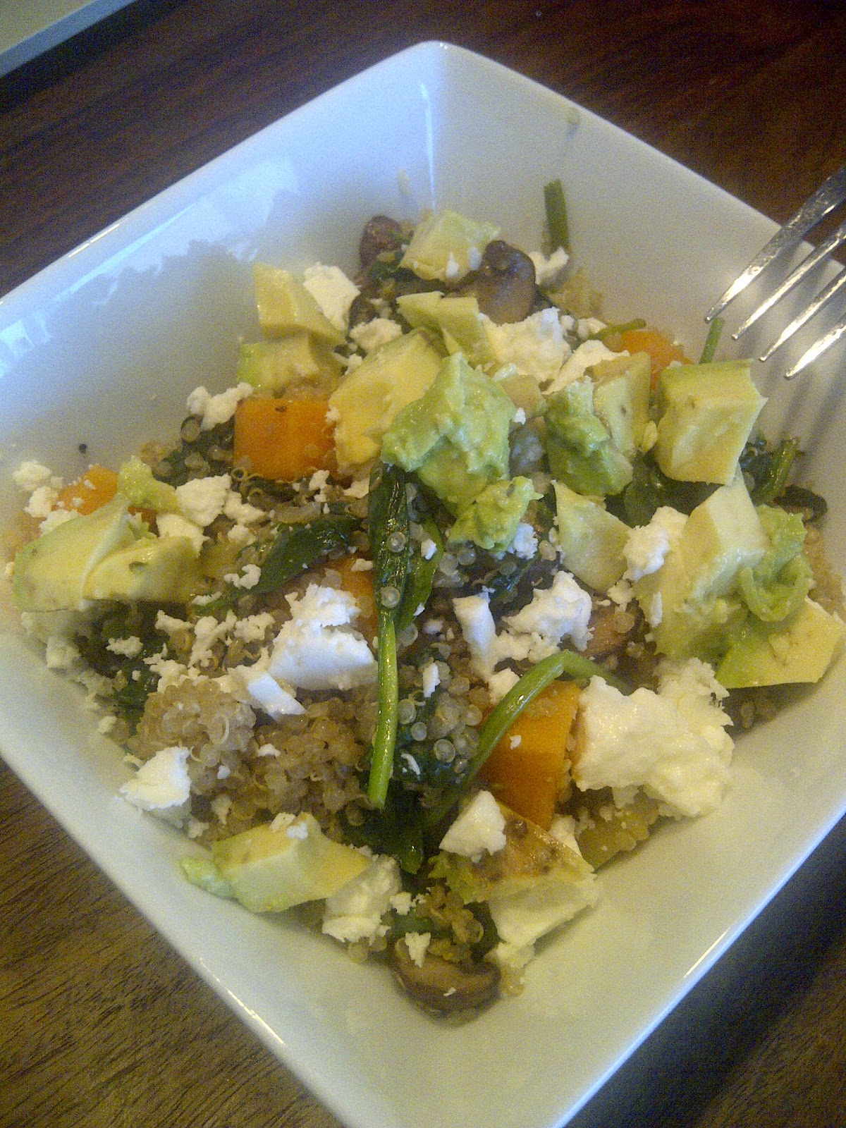 | Lunch (12.30pm) Quinoa, Spinach, Mushrooms, Sweet Potato, Feta cheese and Avocado |