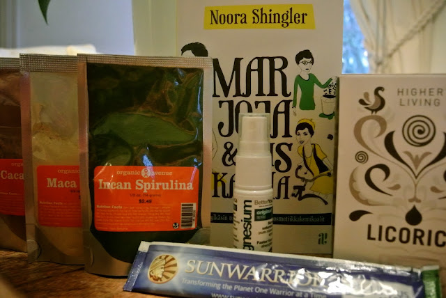Ja sitten vihdoin arvontaan! Nyt olisi kaikkien kirjautuneiden lukijoiden kesken aika arpoa “Goody Bag”, joka sisältää Noora Shinglerin Marjoja ja Maskaraa- kirjan, Magnesiumsuihketta, Organic Avenuelta macaa, spirulinaa ja raakakaakaojauhetta, Lakritsi-teetä sekä Sun Warriorin vanilja proteiinijauhetta.