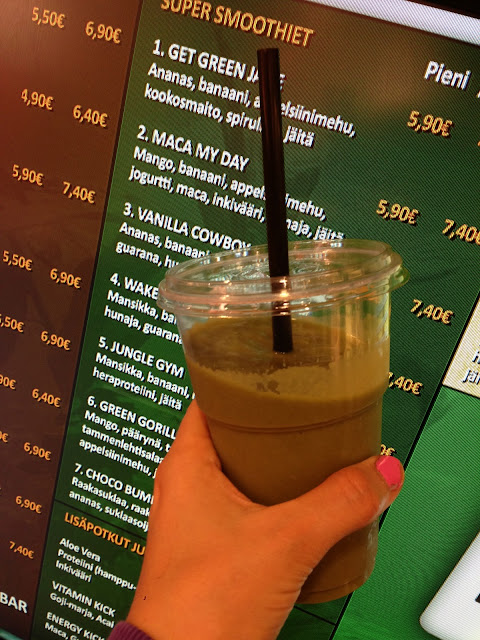 The menu was so long… so many good choises! Hard decisions… I finally choosed Big-Deal Ultimate; avocado, mango, lime, pineapple, pear, oak leaf lettuce, spinach, hemp protein, macs, spirulina, apple juice and some ice. I would have choosen it without apple juice (cause I though that its the commercial one), but luckily the professional Jonne told me, that its all natural products and all the juices are pressed freshly over there! How great is that! This was my first time here, but def not the last… Now you know where to find me 😉