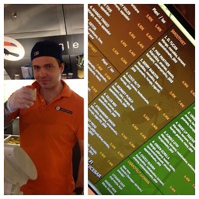 The menu was so long… so many good choises! Hard decisions… I finally choosed Big-Deal Ultimate; avocado, mango, lime, pineapple, pear, oak leaf lettuce, spinach, hemp protein, macs, spirulina, apple juice and some ice. I would have choosen it without apple juice (cause I though that its the commercial one), but luckily the professional Jonne told me, that its all natural products and all the juices are pressed freshly over there! How great is that! This was my first time here, but def not the last… Now you know where to find me 😉