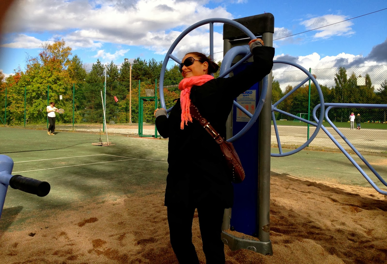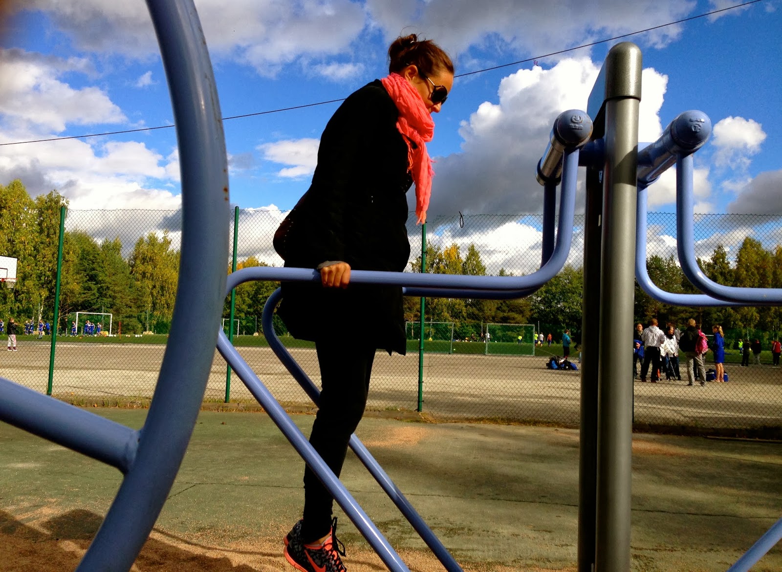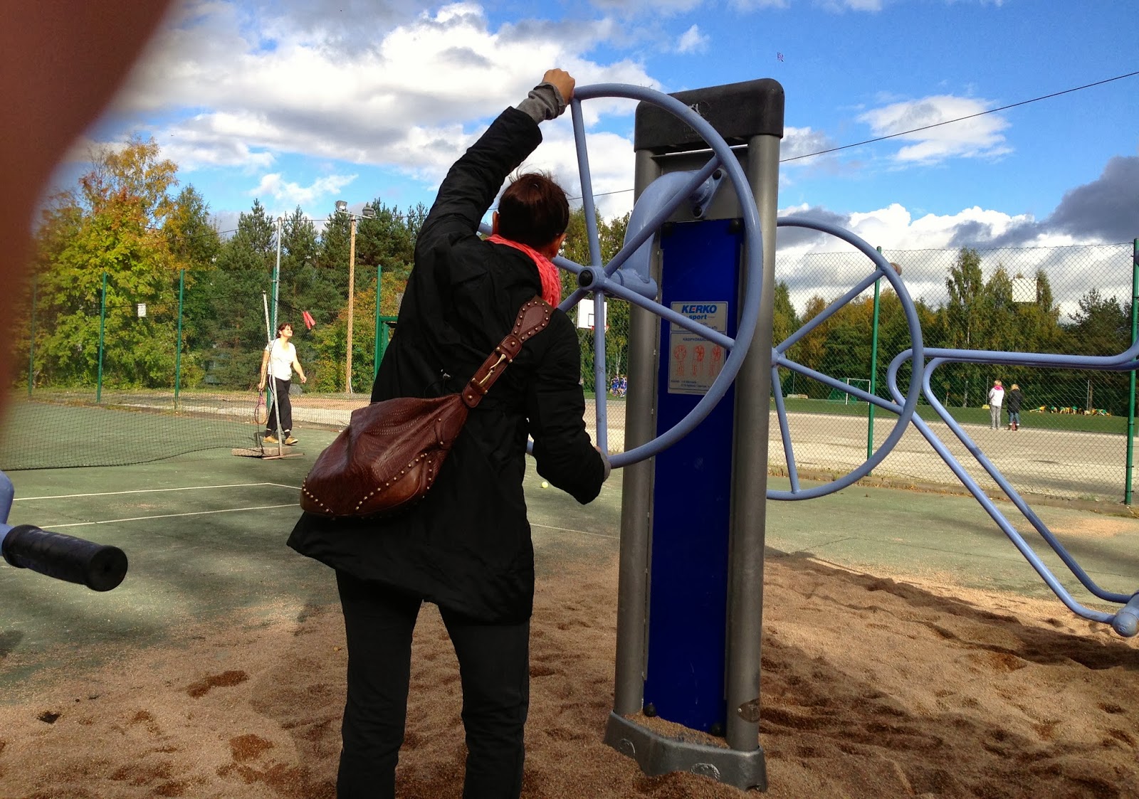 Eilen pojan pelissä oli jo niin tuulinen ja kylmä ilma, että oli kaivettava kevyttoppatakki ja villapaita päälle- ja siltikin oli kylmä! Pelipaikalla oli kuntoilulaitteita, joita käytettiin hyödyksi lämmikkeenä ennen peliä ja pelin jälkeen! 15-20 toistoa/laite ja kierroksia kolme! Hauska minicircuit ulkona, ja varmasti keho lämpeni 🙂 Lisäpainona toimi kassi olalla!